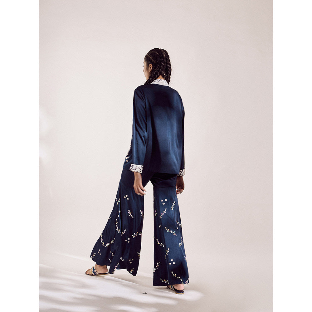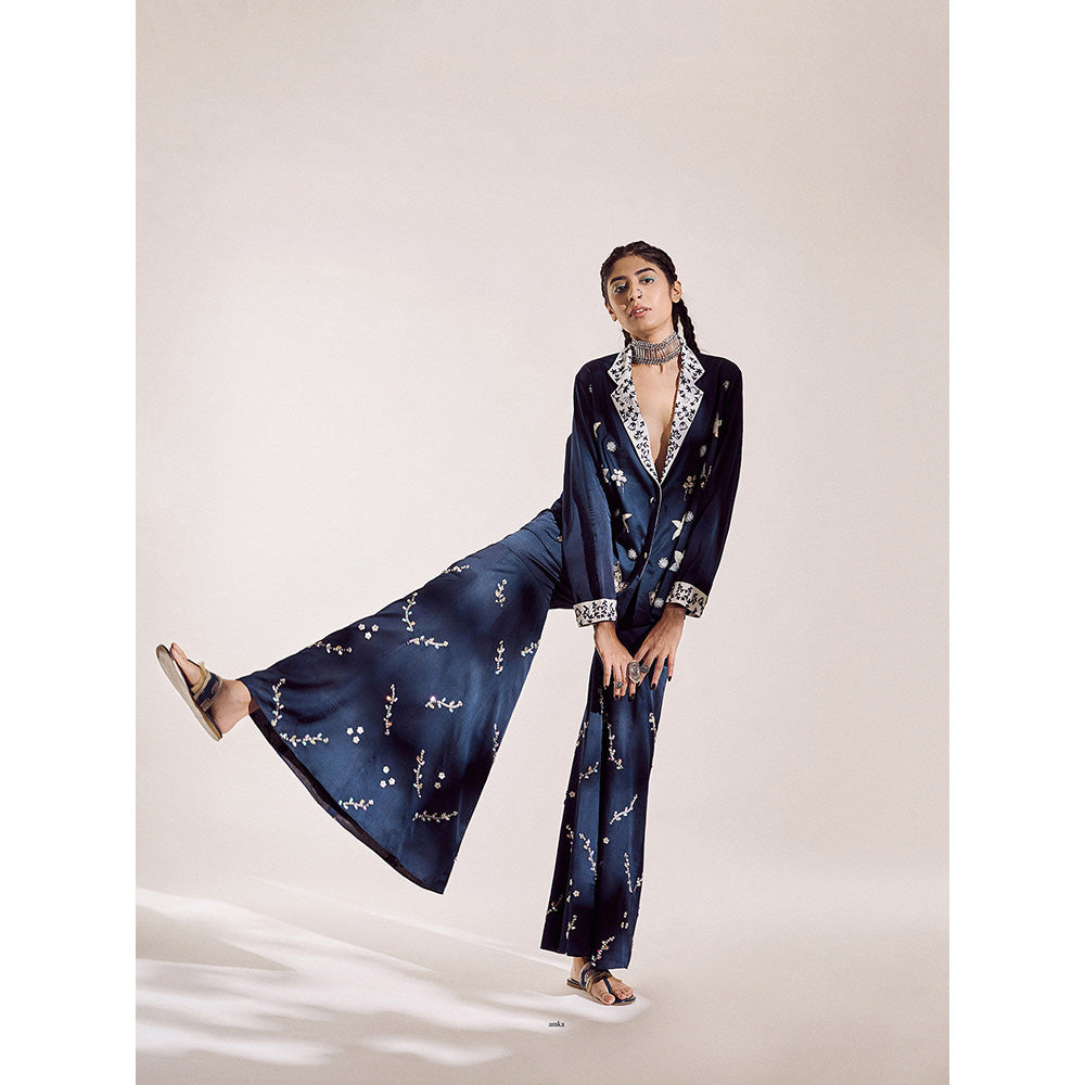 Description : Milk Candle is handembroided heaven on its own, it is definietly a show stealer that has unique tone of midnight blue plus purple shade that is made up of weightless satin silk. It has detailed monochrome work on collar and cuffs.