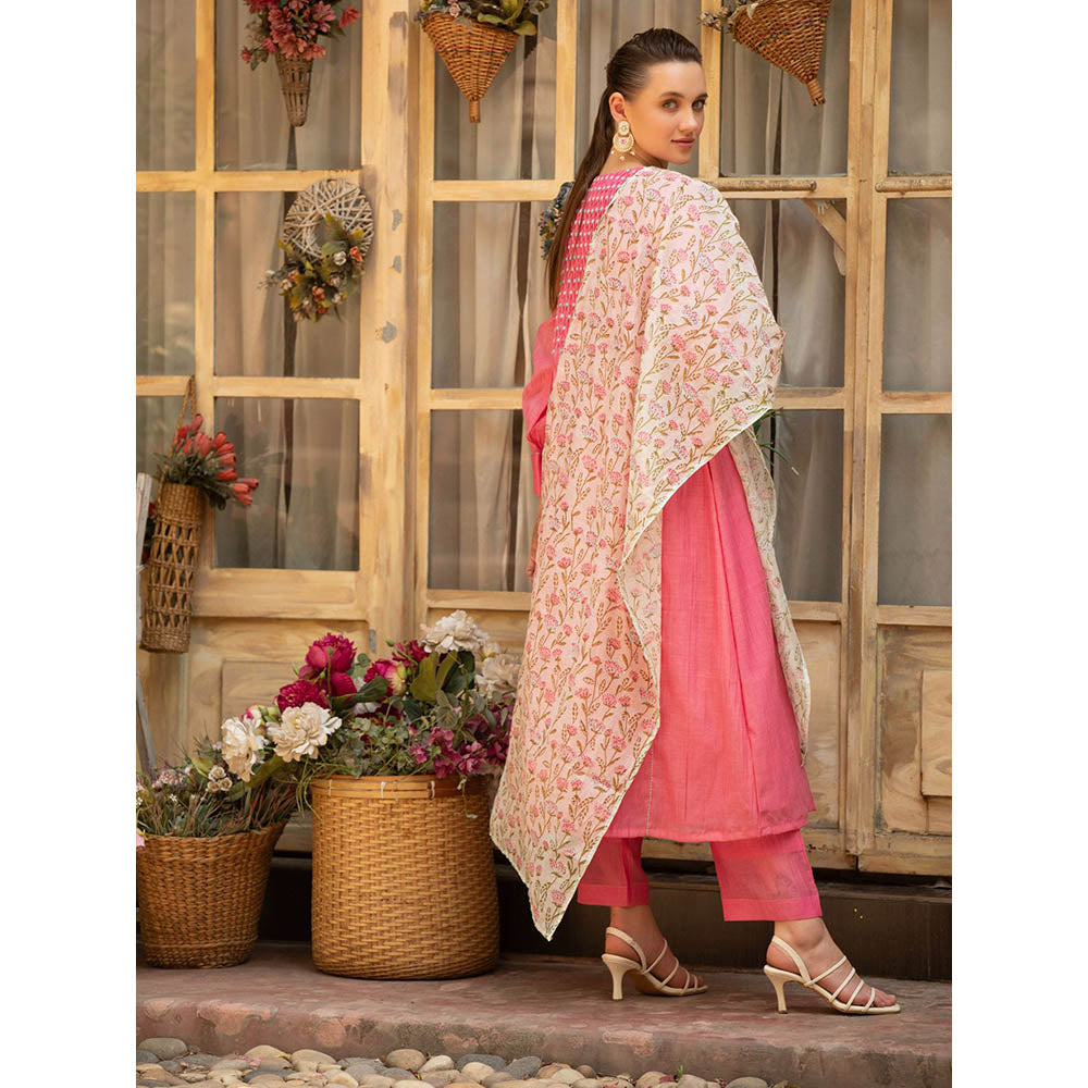 Description : Elegant Three-Piece Kurta Set Crafted From Handloom Chanderi Fabric, Featuring A Vibrant Pink Hue. The Kurta Is Adorned with Delicate Smocking and Hand Thread Embroidery On The Front Yoke and Sleeves. It Has A Graceful Flare with A Soft Gathered Fall, Paired with Straight Pants and A Floral Printed Dupatta That Adds A Touch Of Charm.