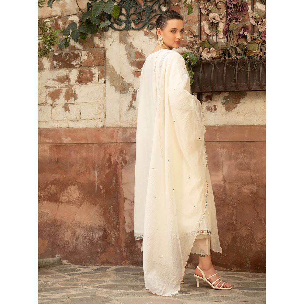 Description : This Elegant Angarkha Kurta Set Is Crafted From Pure Handloom Chanderi Fabric, Offering A Graceful and Lightweight Drape. The Off-White Kurta Features Delicate Multicolor Embroidered Detailing Along The Neckline, Cuffs, and Hemline, Adding A Touch Of Tradition. Paired with Scalloped Hem Pants and A Matching Dupatta Edged with Subtle Colourful Threadwork.