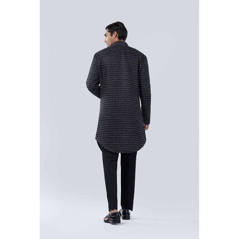 Description : Black Bead And Thread Work Embroidered Bucket Cut Sherwani. Tailored to sartorial perfection from premium quality fabric, it assures a soft and soothing touch against the skin. The exquisite silhouette adds to its appeal.