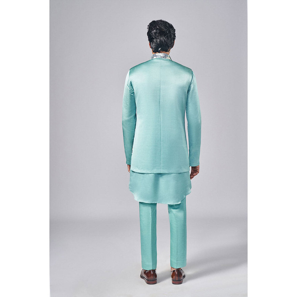 Description : Mint Green Printed Over Lap Bundi Set With Classic Kurta. Tailored to sartorial perfection from premium quality fabric, it assures a soft and soothing touch against the skin. The exquisite silhouette adds to its appeal.