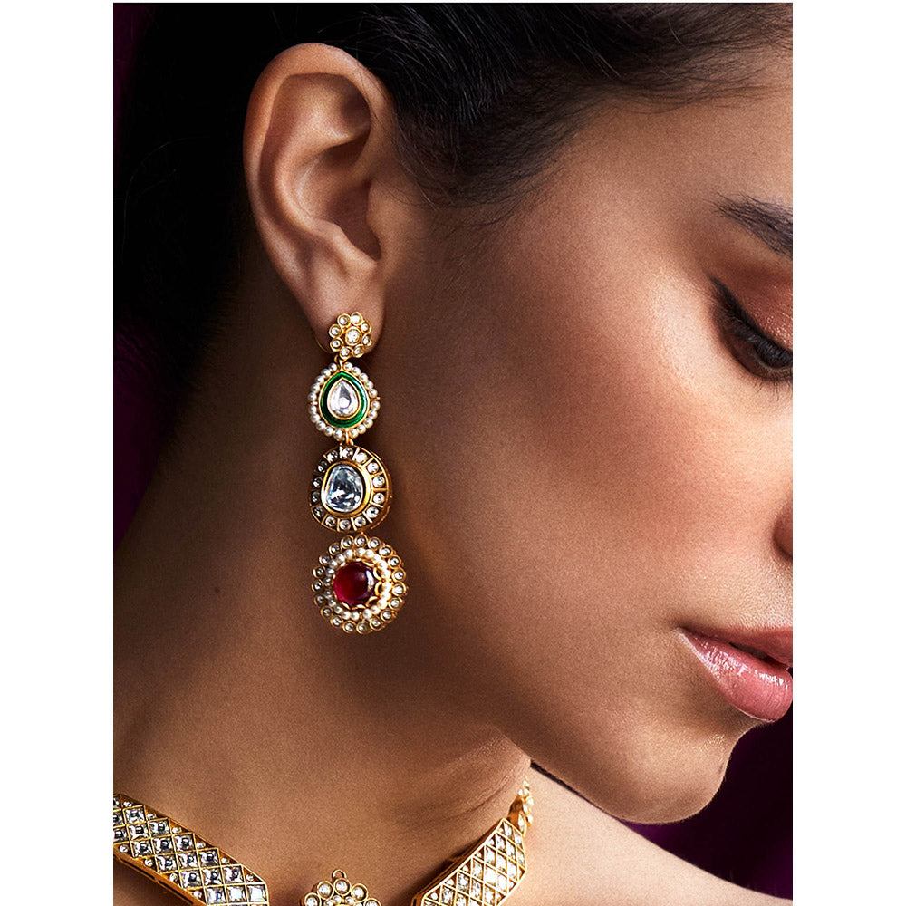 Description : The Essence-Danglers that are inspired by the art and architecture of the Mughal era. Made with Lush Crimson, Pastel Plum, and Iceberg stones these earrings evoke a sense of nostalgia.Consciously Made-You are avoiding the generation of approximately 59,00 kg of toxic waste 1000 kg of CO2 emissions, that mining gold for this jewel would have caused.