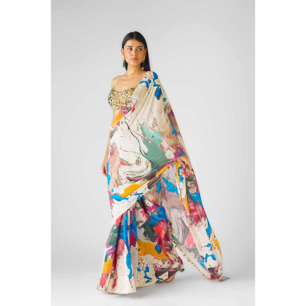 Womens Printed Multi-Color Saree with Stitched Blouse