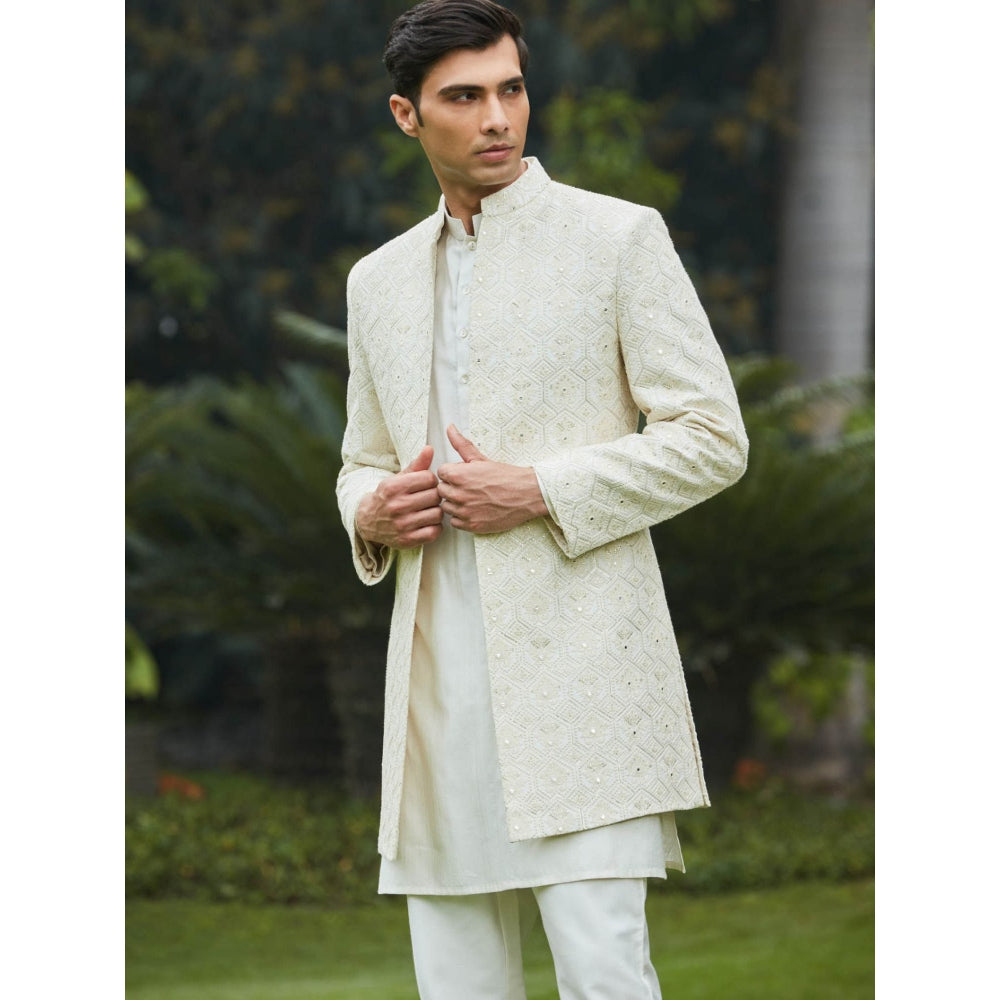 Description : Keep your fashion game strong with our Itvara Open Achkan Kurta Set > Achkan Kurta Fabric: Georgette Chikankari> Kurta Fabric- Cotton Silk Tassar> Pant Fabric- Cotton Silk Tassar> Technique Used- Chikankari> Color- Off White> Full Sleeves> Fit- Slim Fit> Set of 3- Kurta, Kurta, Pants> Please Note: Embroidered Kurta Fabric Shoes/Jutti's can be added, kindly contact for customisation> Please Note: Sizes above XXL, kindly contact for customisation> The model (height is 6 ft) is wearing a size M> Care Instruction - Dry Clean Only> Custom cut, sewn, and packed in New Delhi> Please note that the shoot of the product has been done professionally so sometimes the colors on screen appear brighter. Due to the Lighting during Photo Shooting or the Monitor's Display.> Delivery time: 3 weeks