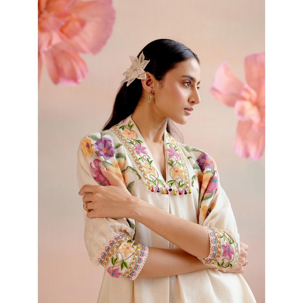 Description : Ivory Chanderi Multi Coloured Floral Beadwork Kimono Tunic With Cuff Detail With Cutwork Pants With Organza Detail