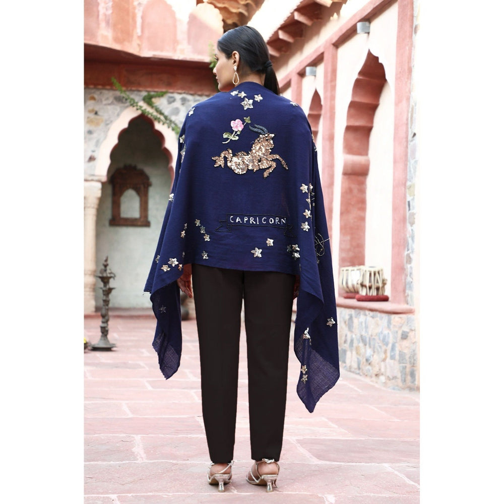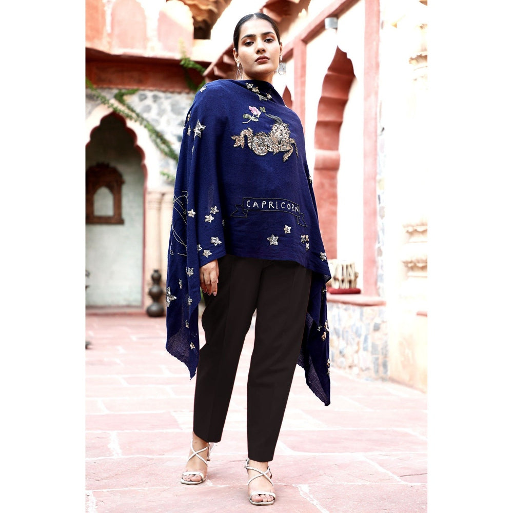 Description : This stole goes well with your unique preference. Wrap yourself with your favorite stole. This stole is ideal for any occasion, including holiday get-togethers and workplace parties. The blue-colored stole has a Capricorn theme with stars and a sea goat. This stole has a design of sequence pipe work and thread work. The fabric is soft to the touch and keeps you warm. You will surely attract compliments when wearing this stole.