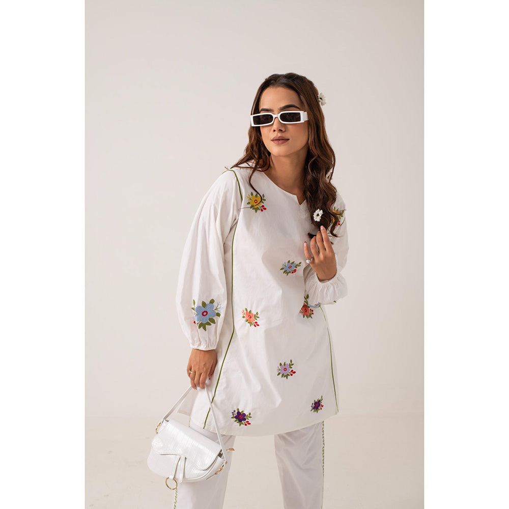 Description : Introducing Amba, A Stylish Short Kurta Set That Combines Modern Flair with Classic Details. The Top Features Full, Puffed Sleeves with Elasticated Edges for A Comfortable and Fashionable Fit. It Is Highlighted By Piping Along The Princess Seam and Adorned with Vibrant Floral Motifs On Both The Front Panel and The Sleeves. The Matching Pants Include Side Embroidery Detailing and Practical Pockets, Blending Style with Functionality. Styling Tips: Amba Is Perfect for Casual Outings or Relaxed Social Events, Offering A Chic and Comfortable Look. The Puffed Sleeves and Floral Details Add A Playful Yet Sophisticated Touch, Making It A Versatile Choice for A Variety Of Occasions. Pair Amba with Strappy Sandals or Simple Flats To Keep The Look Relaxed and Effortless. Complement The Floral Motifs with Delicate Jewellery, Such As A Dainty Bracelet or Small Earrings, To Enhance The Ensemble Without Overpowering It. Whether You're Enjoying A Day Out or Attending A Casual Gathering, Amba Ensures You Stay Stylish and Comfortable. Fabric Details: 100% Pure Cotton Poplin