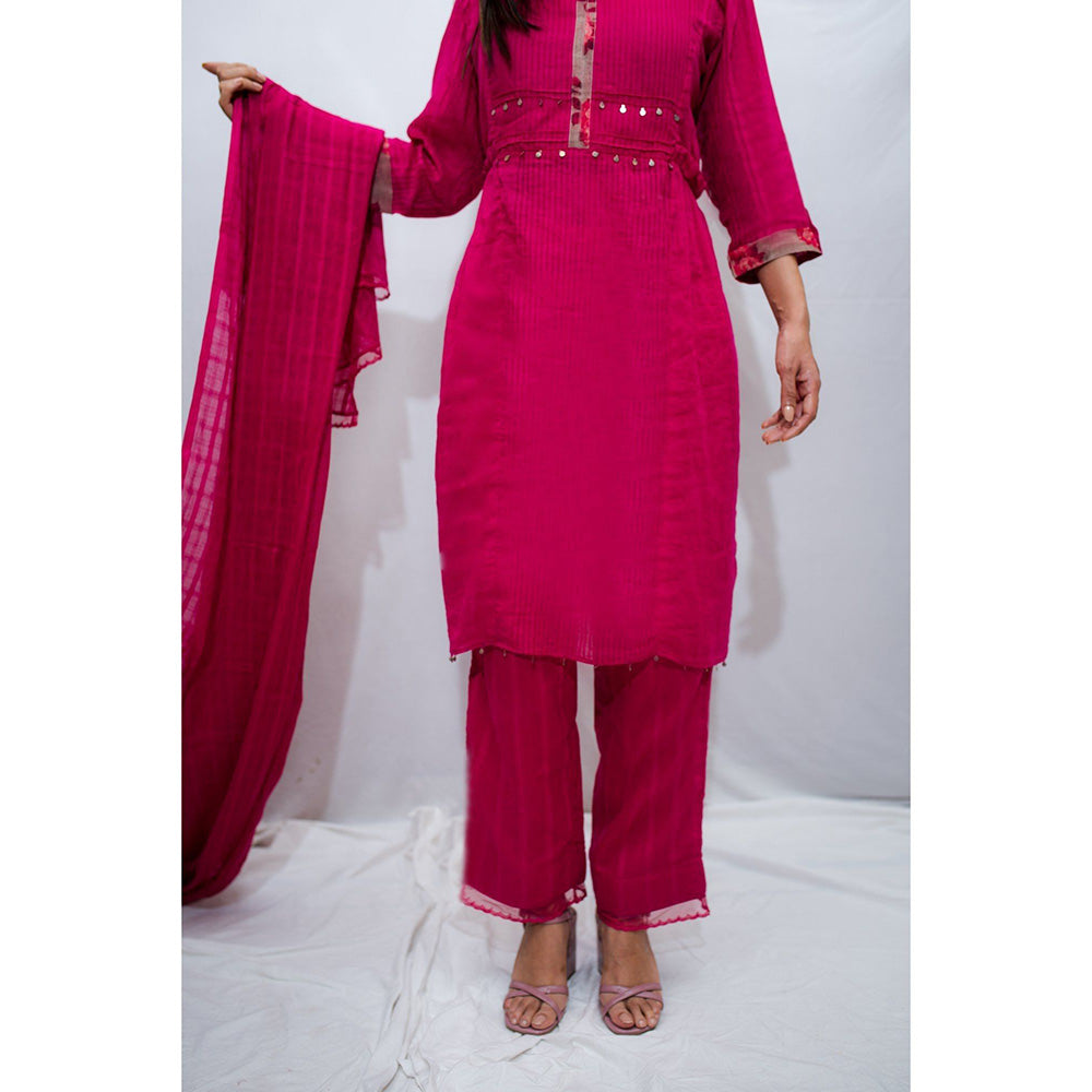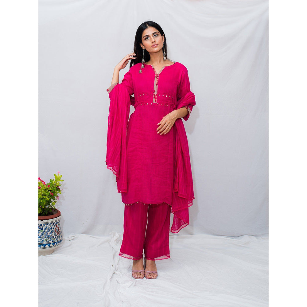 Description : Hot Pink Self Cotton Shirt With Floral Neck + Arm Details With Side Gathers. Dull Silver Coins Are Used To Highlight The Yoke And Hemline. This Is Paired With A Classic Cotton Pant And Dupatta With Sheer Lace Details. Colour: Hot Pink Fabric: Cotton Details: Coins Detail