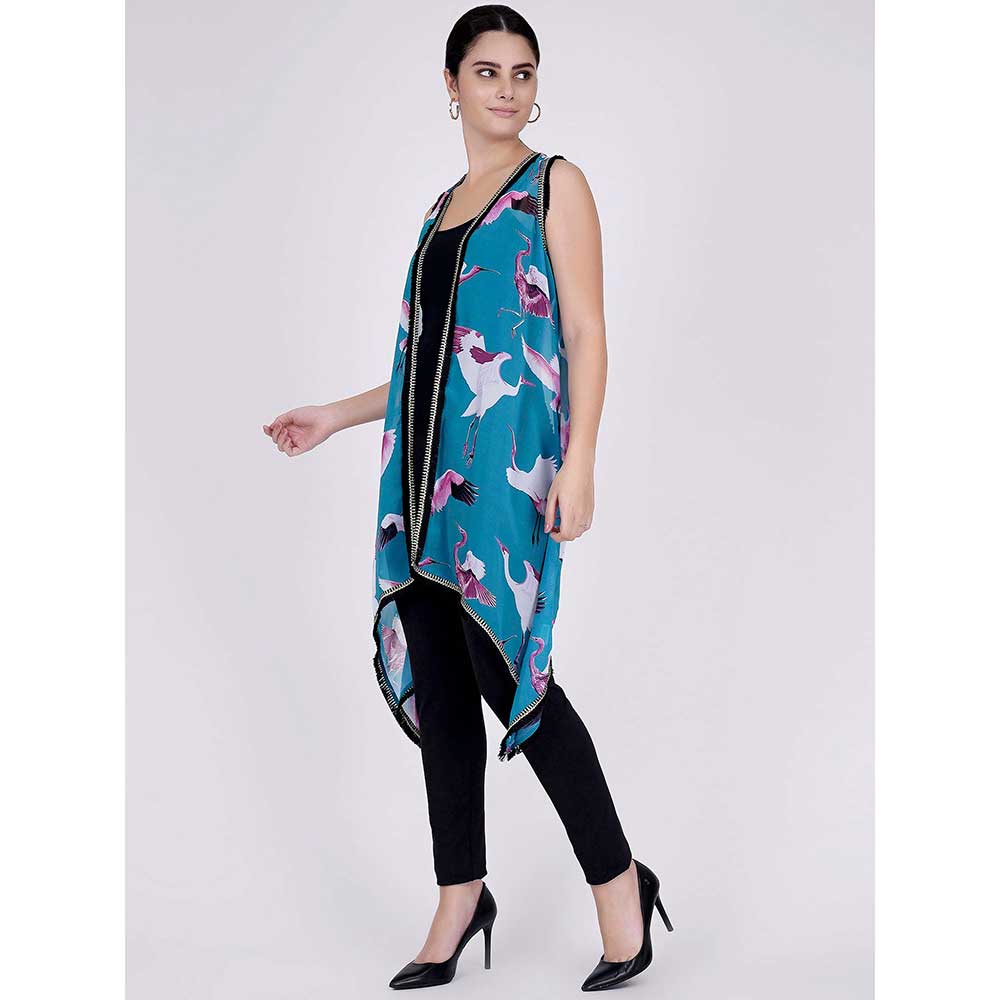 Description : Simplicity never goes out of style. Crush on this tropical blue flamingo print shrug from First Resort by Ramola Bachchan finished with black and gold-edged lace detail on hem. Tag with your outfit for an elevated look.