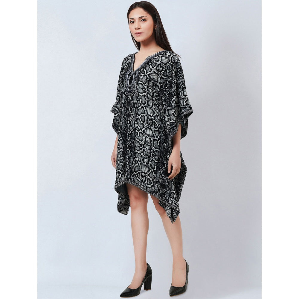 Description : Animal prints are always in fashion. Upgrade your wardrobe with this grey hand embroidered animal print kaftan tunic.
