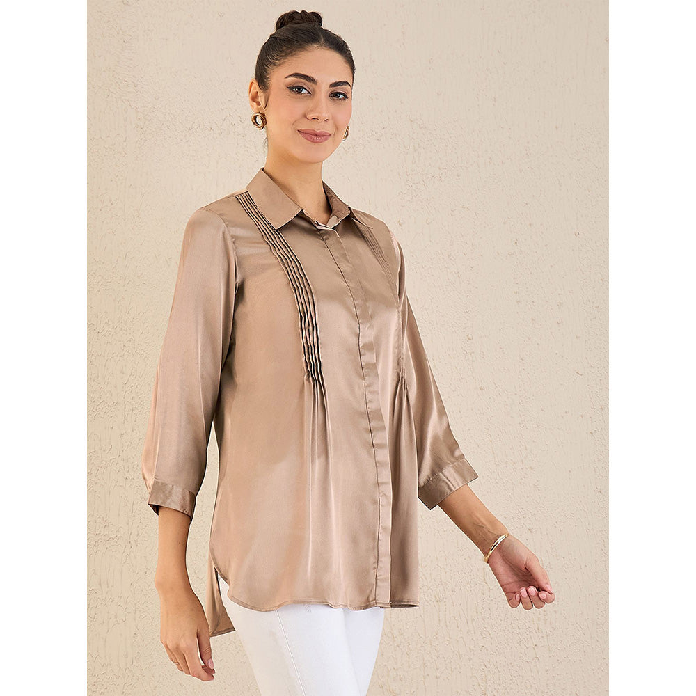First Resort by Ramola Bachchan Hazel Brown Pintucked Satin Shirt