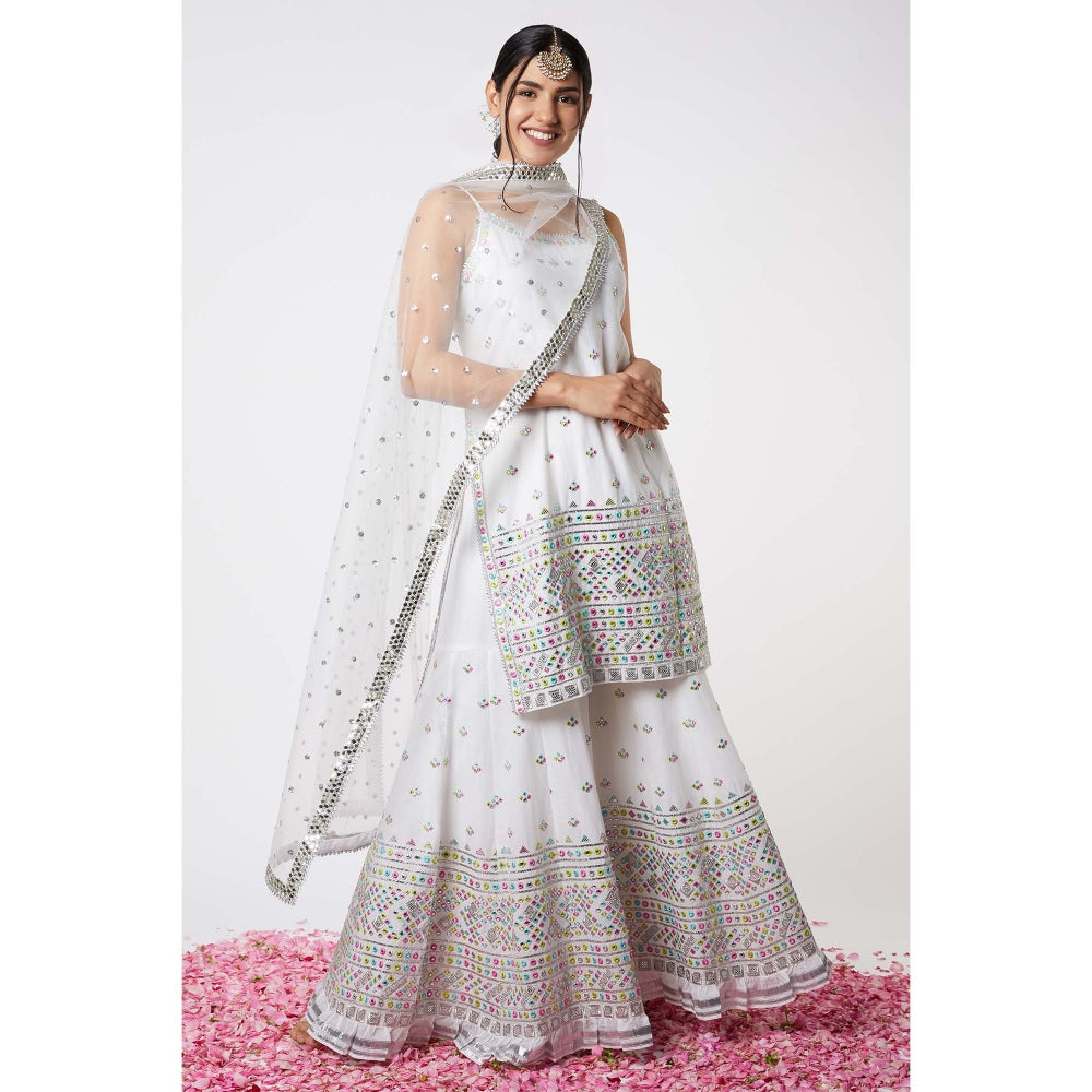 Description : In ivory color, this short, cotton silk, strappy kurta is smartly embellished with applique, mirrors and gota trim. paired with an embroidered sharara and matching dupatta, it has a young, happy vibe!