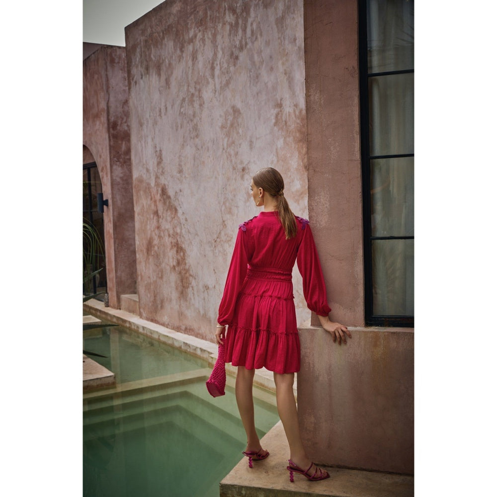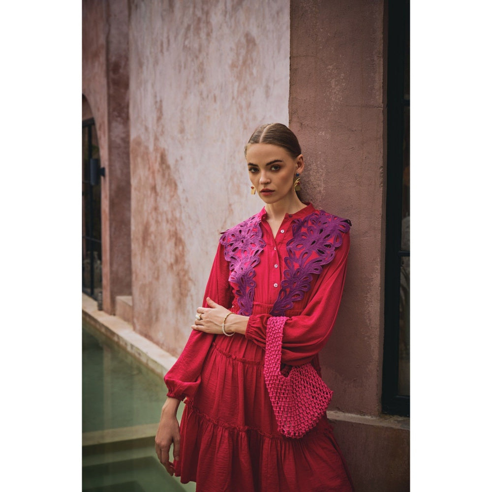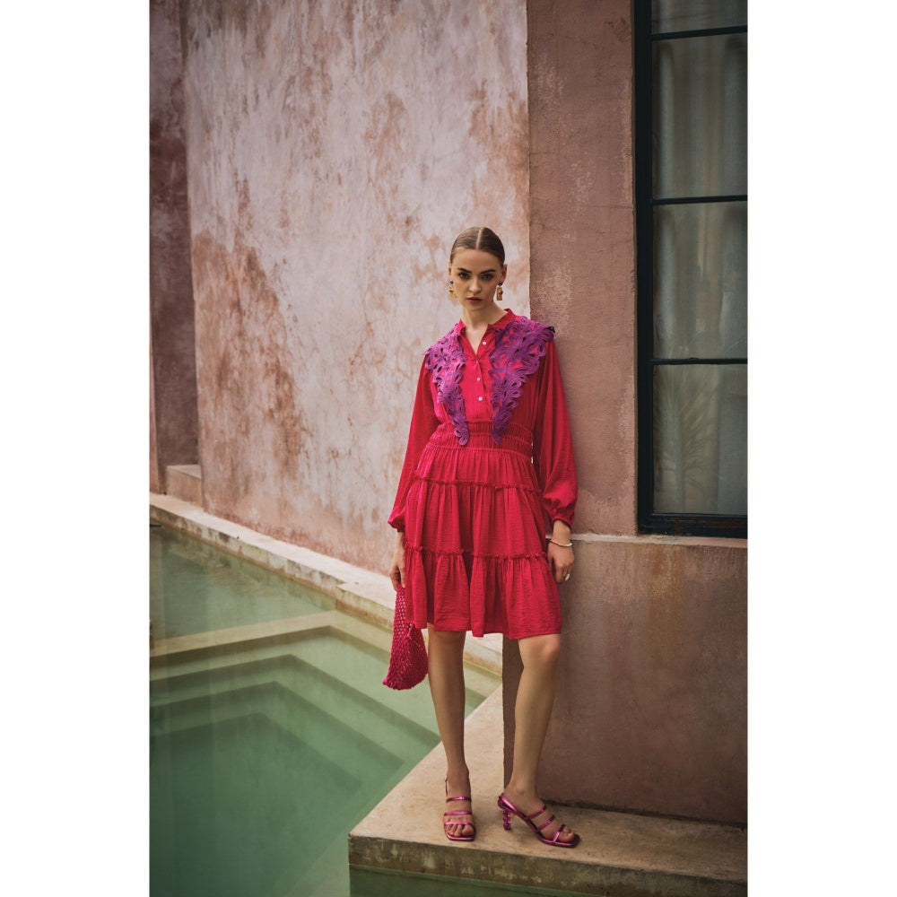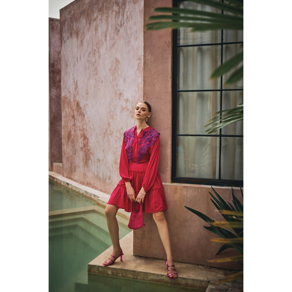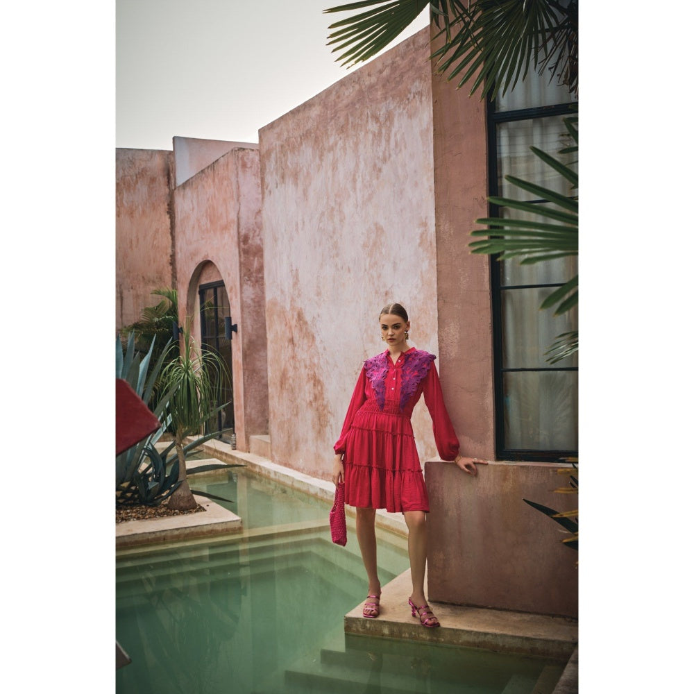 Description : "As The Air Turns Cooler, The Drama Only Heats Up. " Product Details: Meet Your New Go-To Piece: This Tiered Short Dress With A Stylish Mandarin Collar! Featuring Long Puff Sleeves That Make A Bold Statement, It's Designed With An Elasticated Waist For A Flattering Fit That Flows Into A Tiered, Ruffled Skirt, Giving You All The Movement You Crave. Made From Vibrant Pink Fabric, This Dress Radiates Playful Elegance, While The Cutout Patchwork Embroidery In Rich Purple On The Bodice Adds A Stunning Contrast. This Dress Is The Embodiment Of Feminine Charm With Eye-Catching Details details:-Color: Pink-Fabric: Viscose Crepe-Dress Length: 36 Inches-Sleeve Length: 21. 75 Inches-This Sku Includes The Dress Only-Model Is 5Ft 8", Wearing Size Xs-Care Instruction: Dry Clean Only