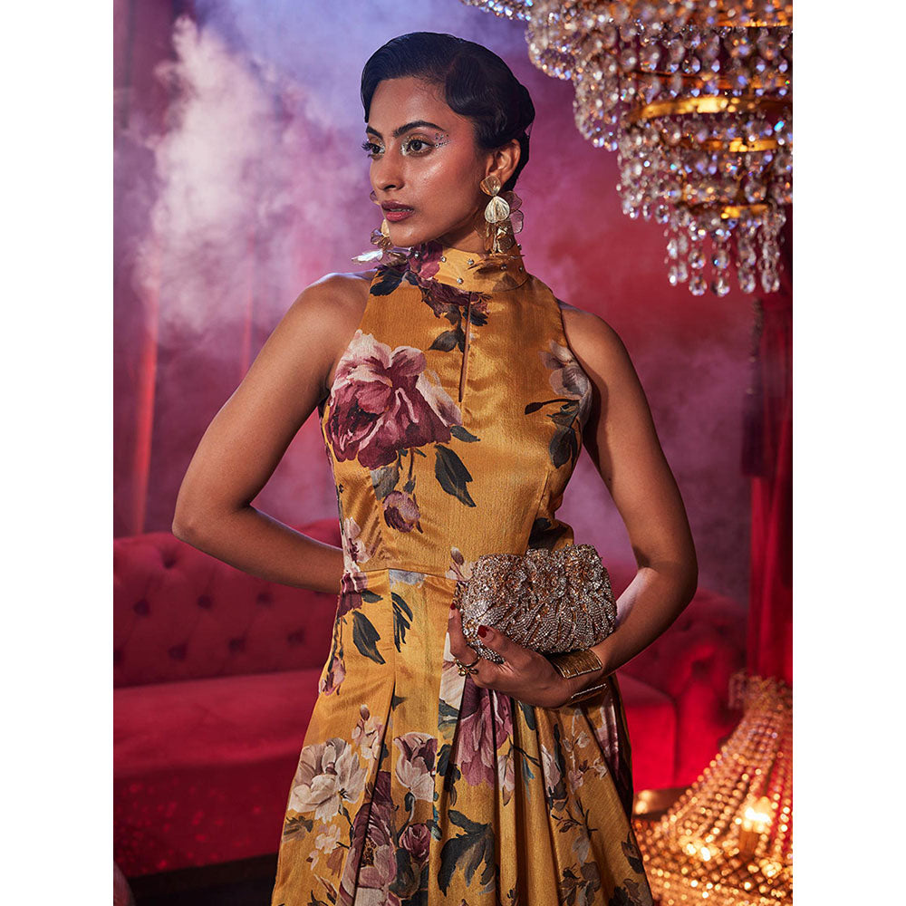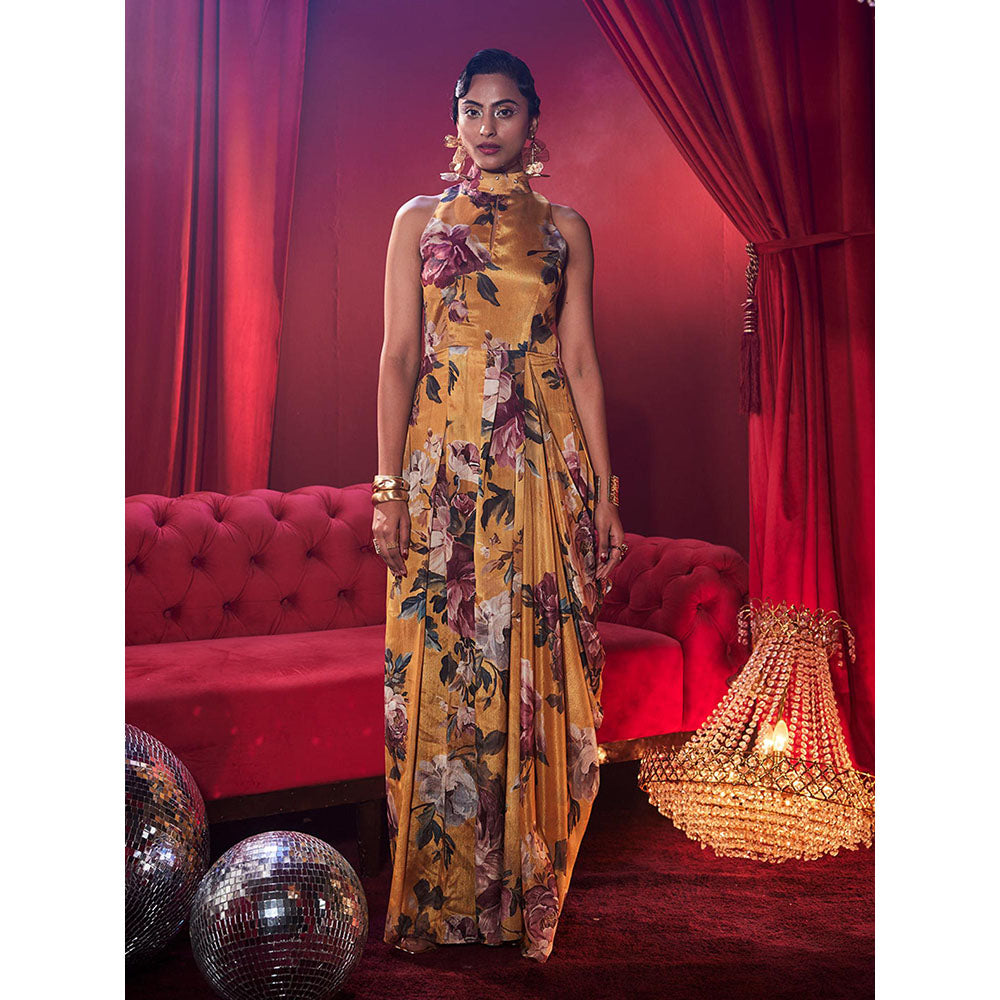 Description : Merging Sophistication With Charm, This Jumpsuit Features Draped Pleats That Fall Fluidly To The Hem. The Mustard Floral Print Radiates Golden-Hour Warmth, While The High Neck With Delicate Embroidery Adds Artisanal Detail. A Cinched Waist Sculpts The Silhouette, Finished With A Concealed Back Zip For A Sleek Fit - Perfect For Brunches, Soirees, And City Strolls.