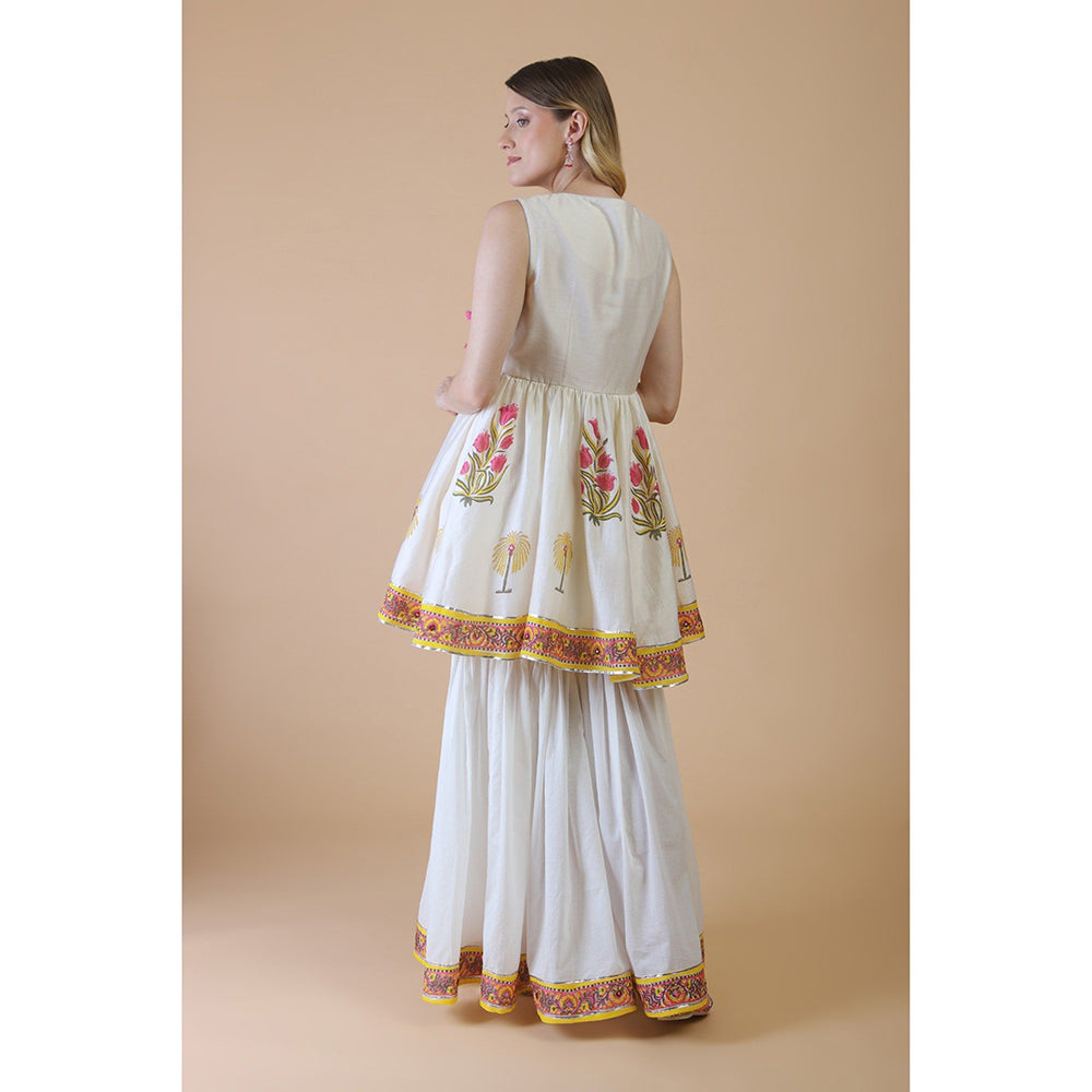 Description : Featuring Off White Block Print Embroidered Stylised Kurta With White Cotton Sharara And Printed Dupatta Set