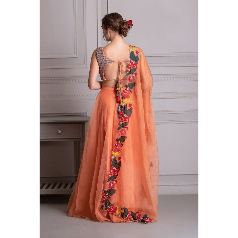 House of Tushaom Orange Lehenga with Mirror Work Blouse and Dupatta (Set of 3)
