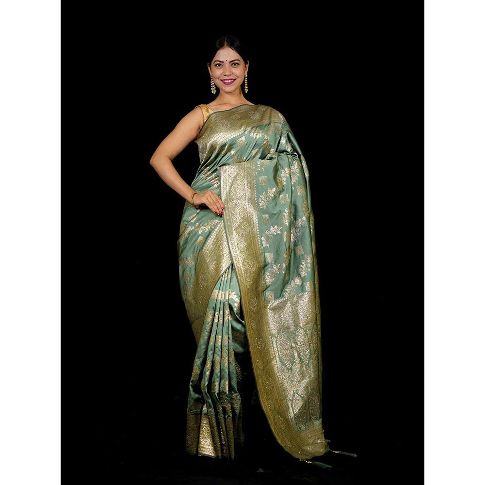 Green Woven Pre-Draped Saree with Unstitched Blouse