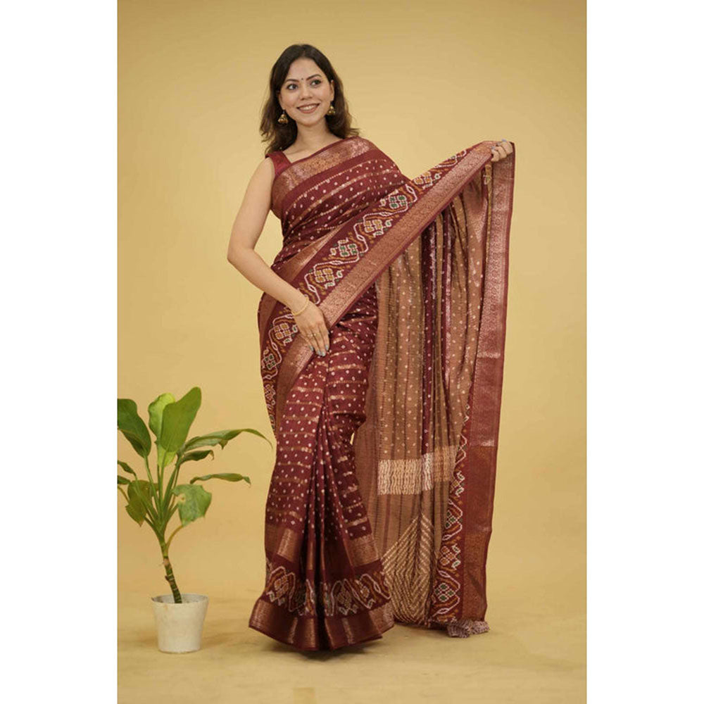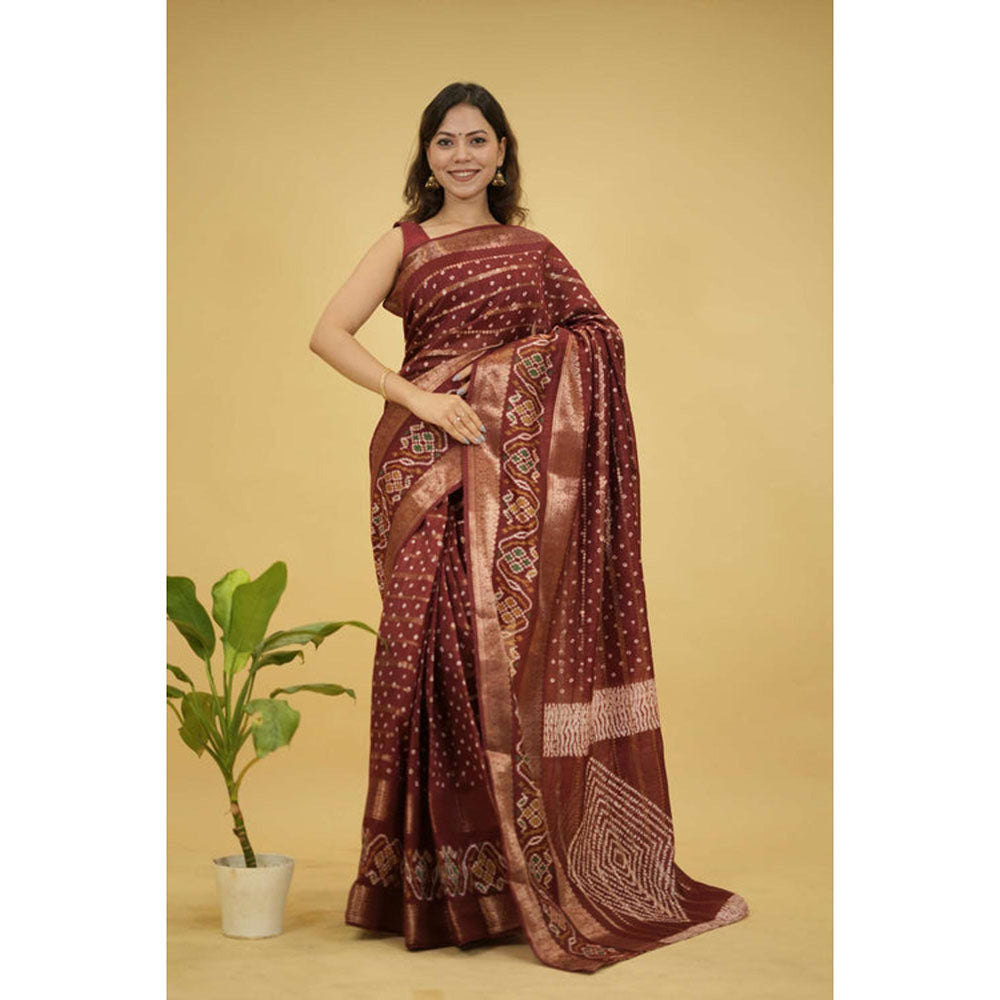 Womens Bandhani Printed Maroon Pre-Draped Saree With Unstitched Blouse