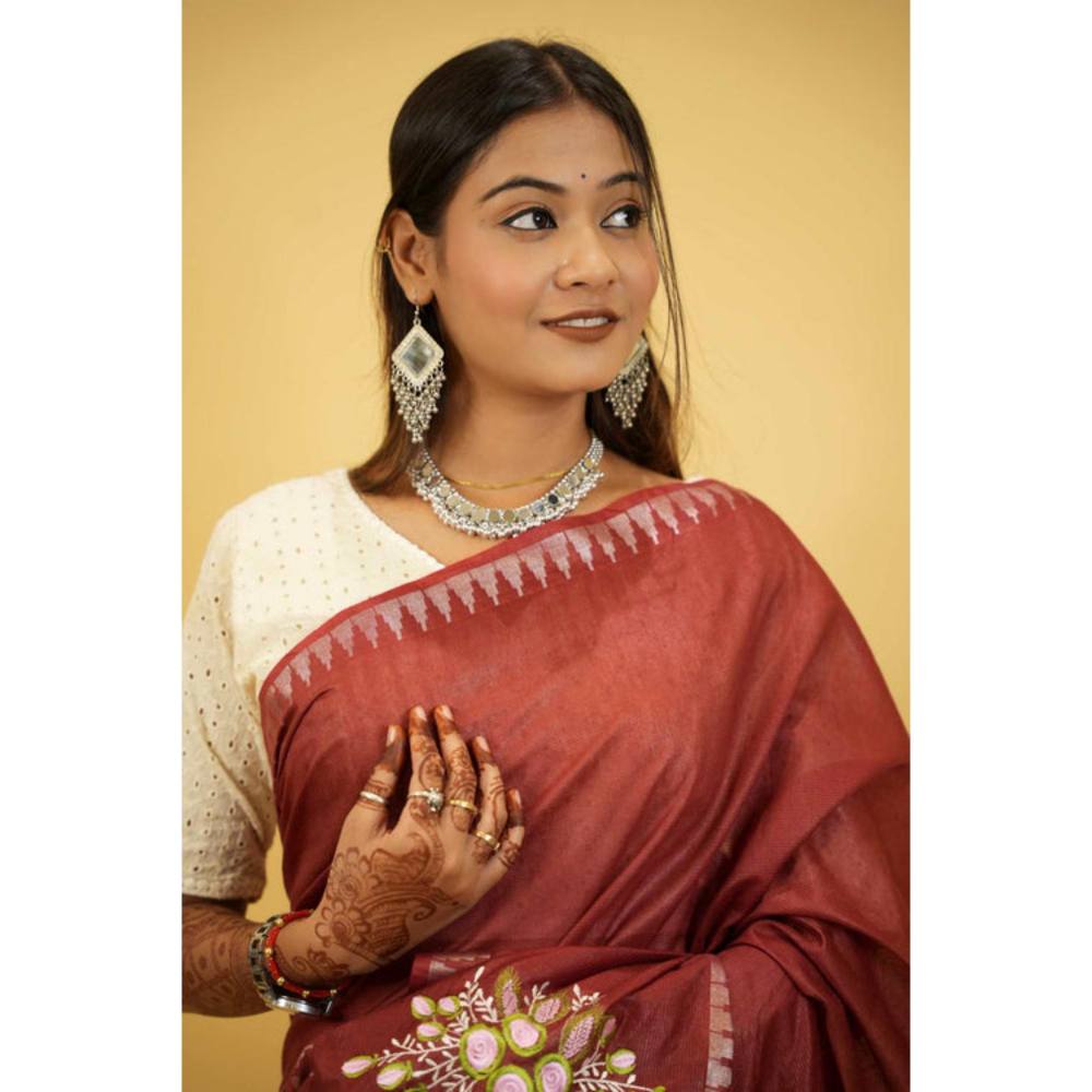 Isadora Life Womens Embroidered Tassels Brown Pre-Draped Saree With Unstitched Blouse
