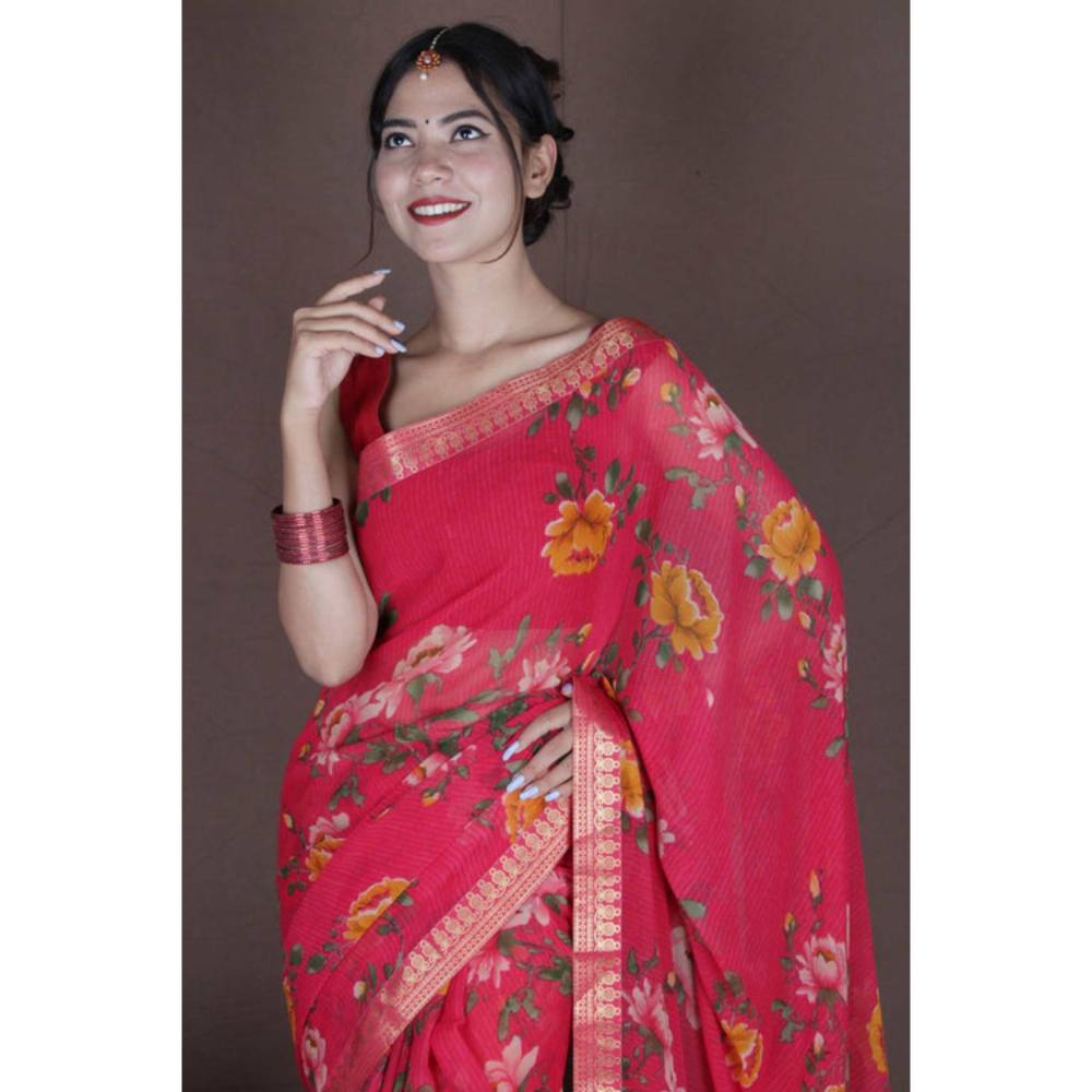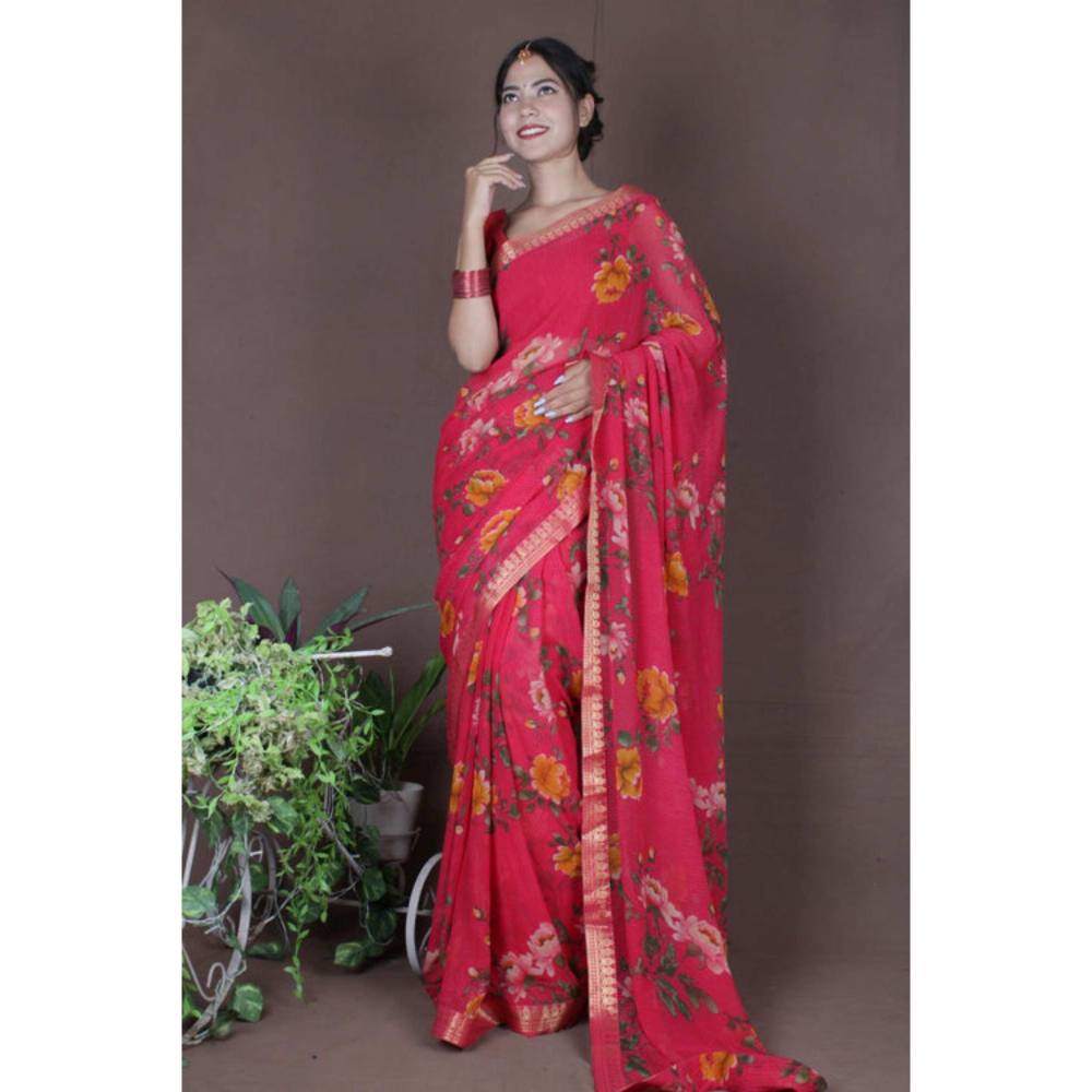 Womens Floral Printed Pink Pre-Draped Saree With Unstitched Blouse