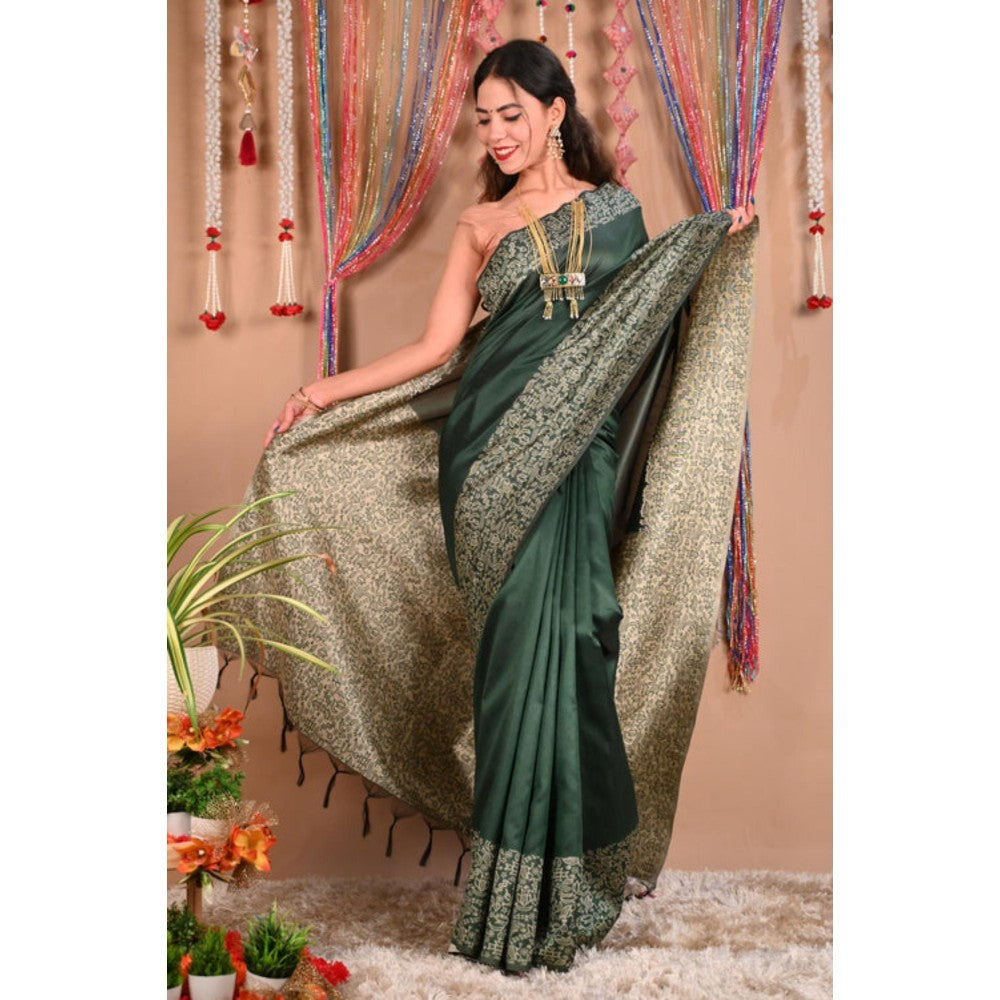 Isadora Life Womens Printed Tassels Green Pre-Draped Saree With Unstitched Blouse