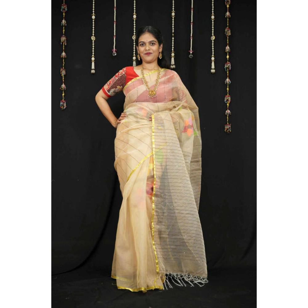 Isadora Life Womens Stripes Tassels Beige Pre-Draped Saree With Unstitched Blouse