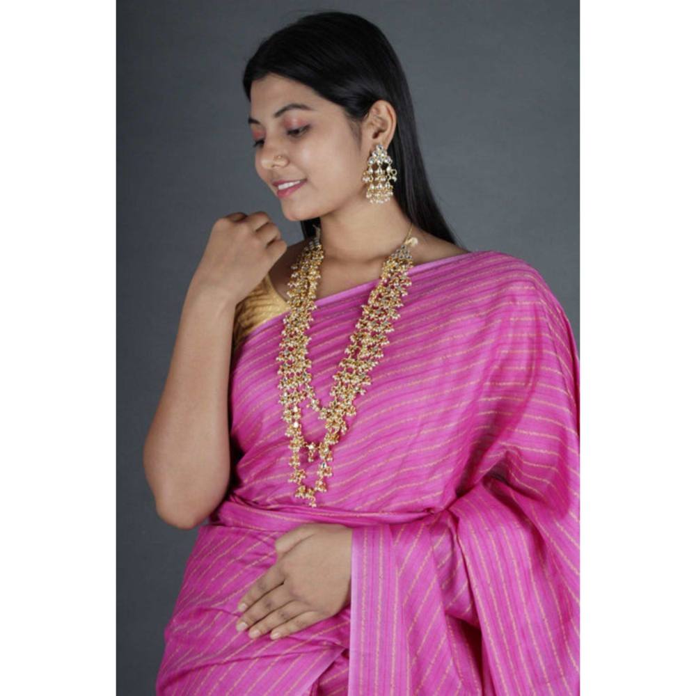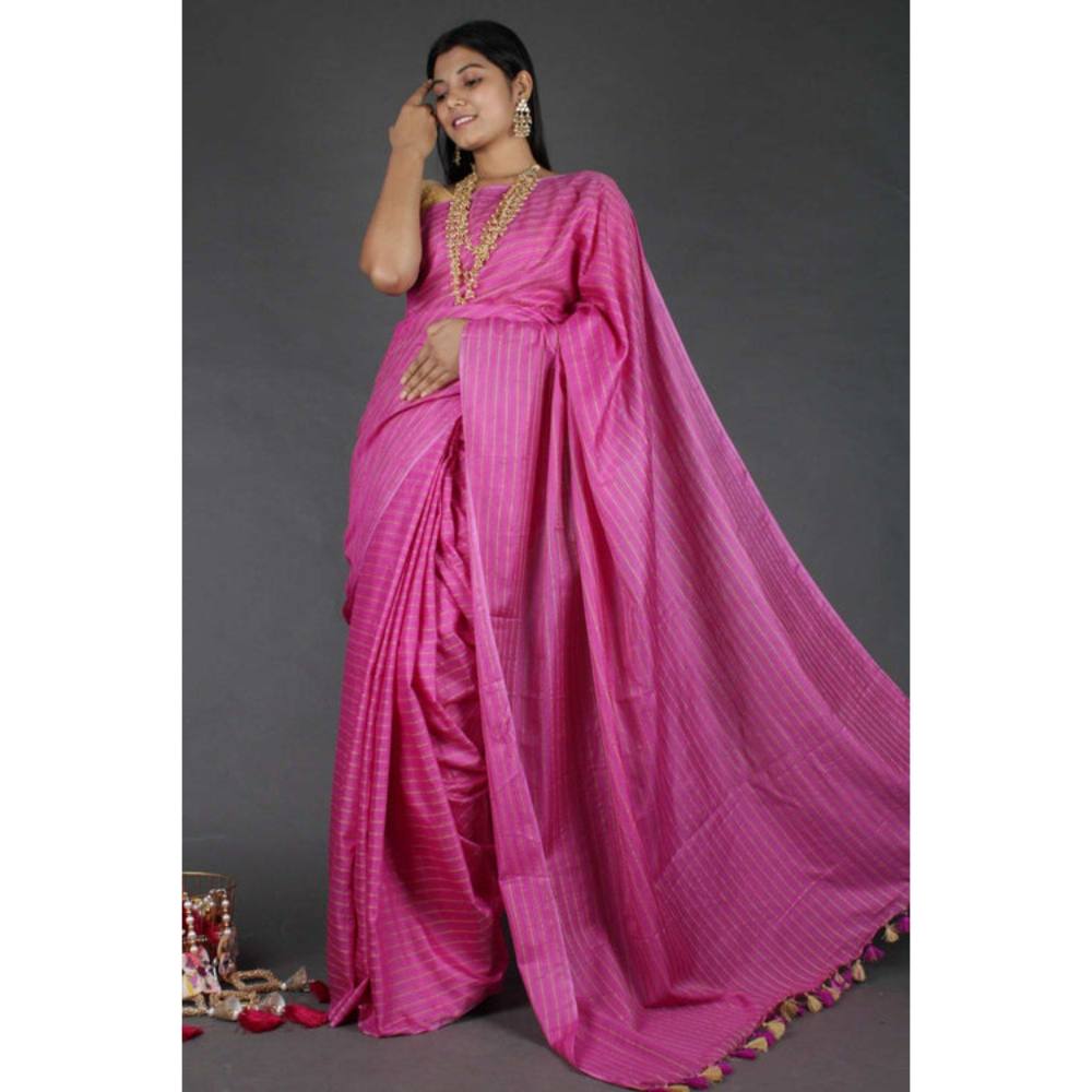 Womens Stripes Zari Pink Pre-Draped Saree with Unstitched Blouse