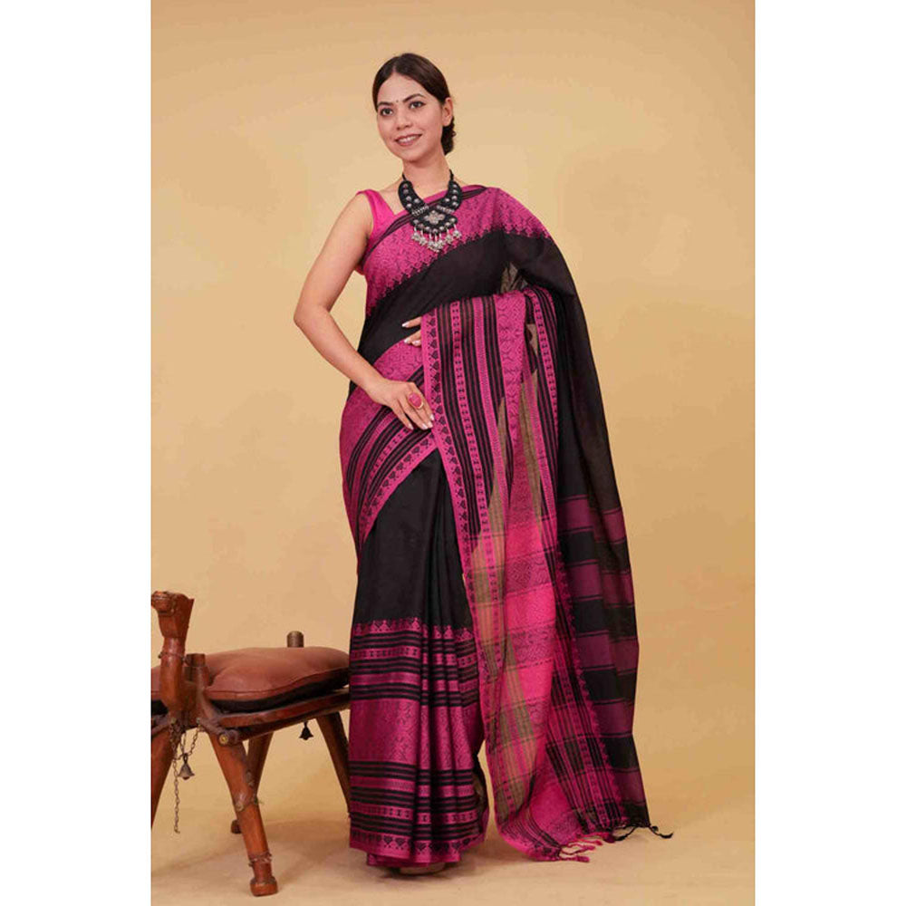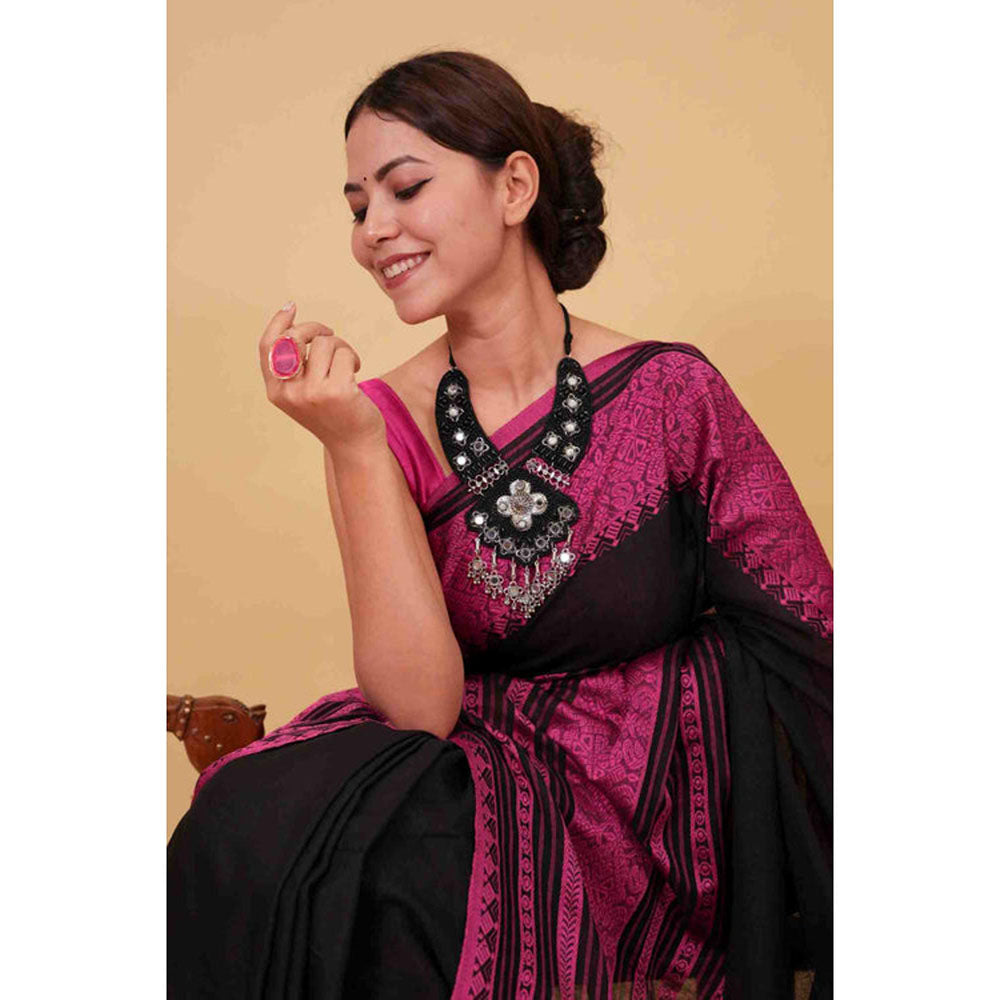 description : Embrace timeless tradition with our exquisite black saree paired with an unstitched blouse piece, giving you the freedom to customize your perfect fit and style. Crafted from luxurious fabric of cotton that flows effortlessly, this saree showcases intricate detailing and vibrant hues designed to turn heads at any celebration or festive occasion. The unstitched blouse lets you tailor the look exactly how you envision be it classic, contemporary, or somewhere in between. Whether draped for weddings, parties, or cultural events, this set promises grace, comfort, and endless styling possibilities.