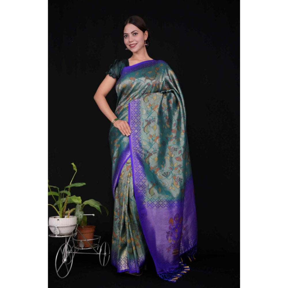 Womens Woven Tassels Blue Pre-Draped Saree With Unstitched Blouse