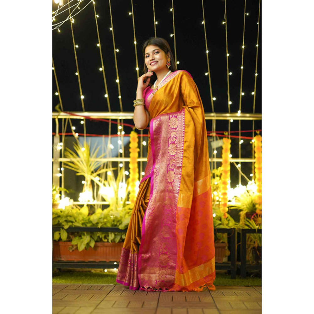 Womens Woven Tassels Mustard Pre-Draped Saree With Unstitched Blouse