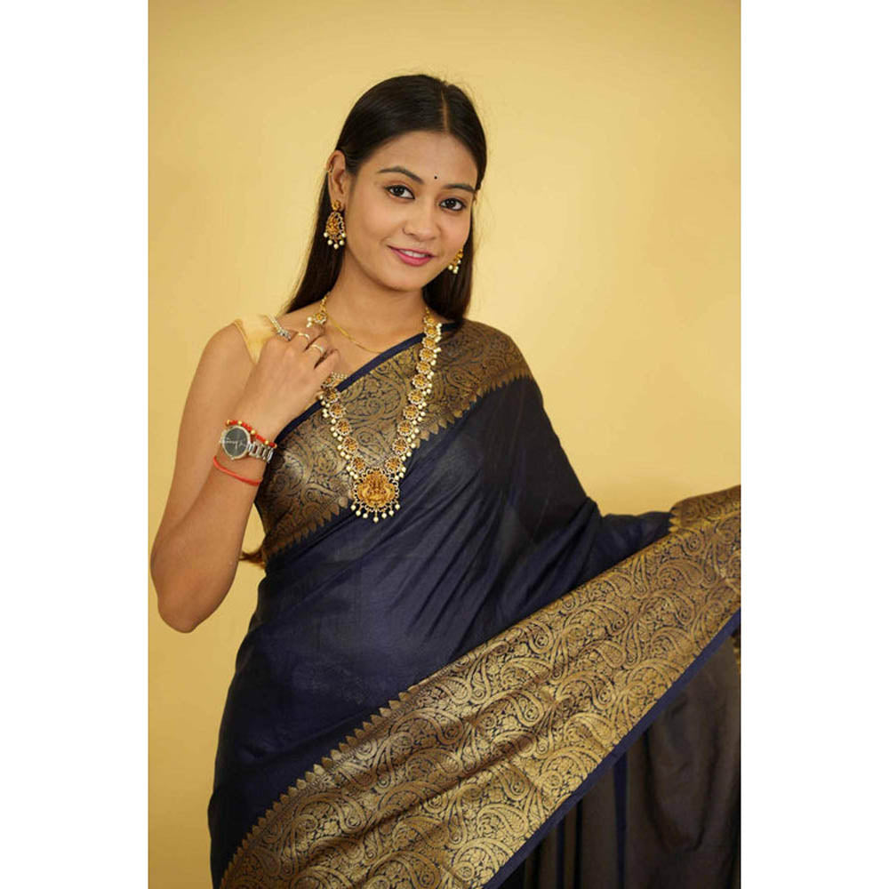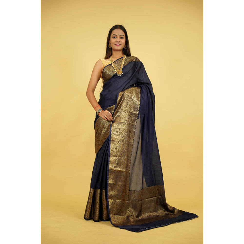 Isadora Life Womens Woven Zari Navy Blue Pre-Draped Saree With Unstitched Blouse