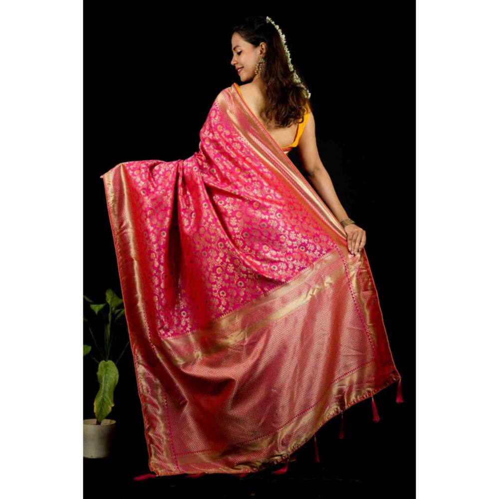 Isadora Life Womens Woven Zari Pink Pre-Draped Saree With Unstitched Blouse