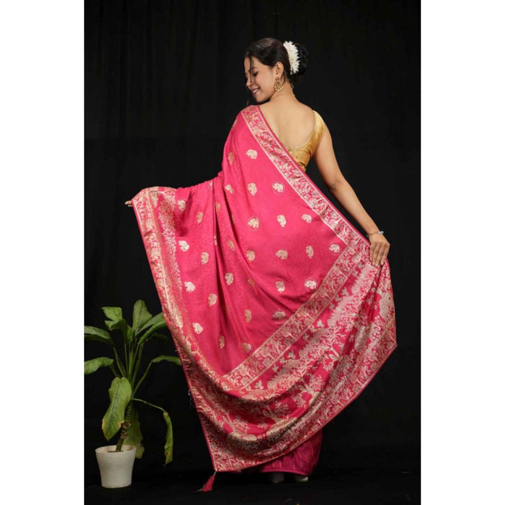 Isadora Life Womens Woven Zari Pink Pre-Draped Saree With Unstitched Blouse