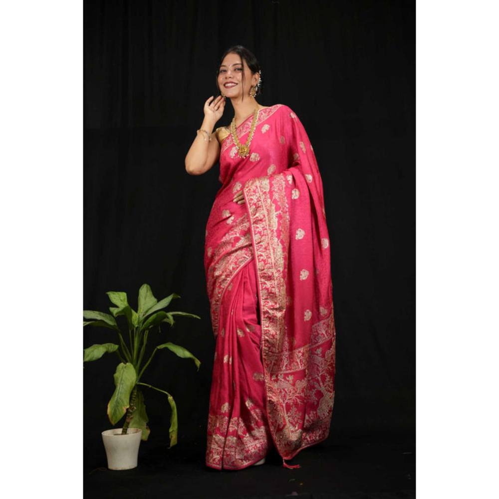 Description : Embrace timeless tradition with our exquisite pink saree paired with an unstitched blouse piece, giving you the freedom to customize your perfect fit and style. Crafted from luxurious fabric of banarasi silk that flows effortlessly, this saree showcases intricate detailing and vibrant hues designed to turn heads at any celebration or festive occasion. The unstitched blouse lets you tailor the look exactly how you envision be it classic, contemporary, or somewhere in between. Whether draped for weddings, parties, or cultural events, this set promises grace, comfort, and endless styling possibilities.