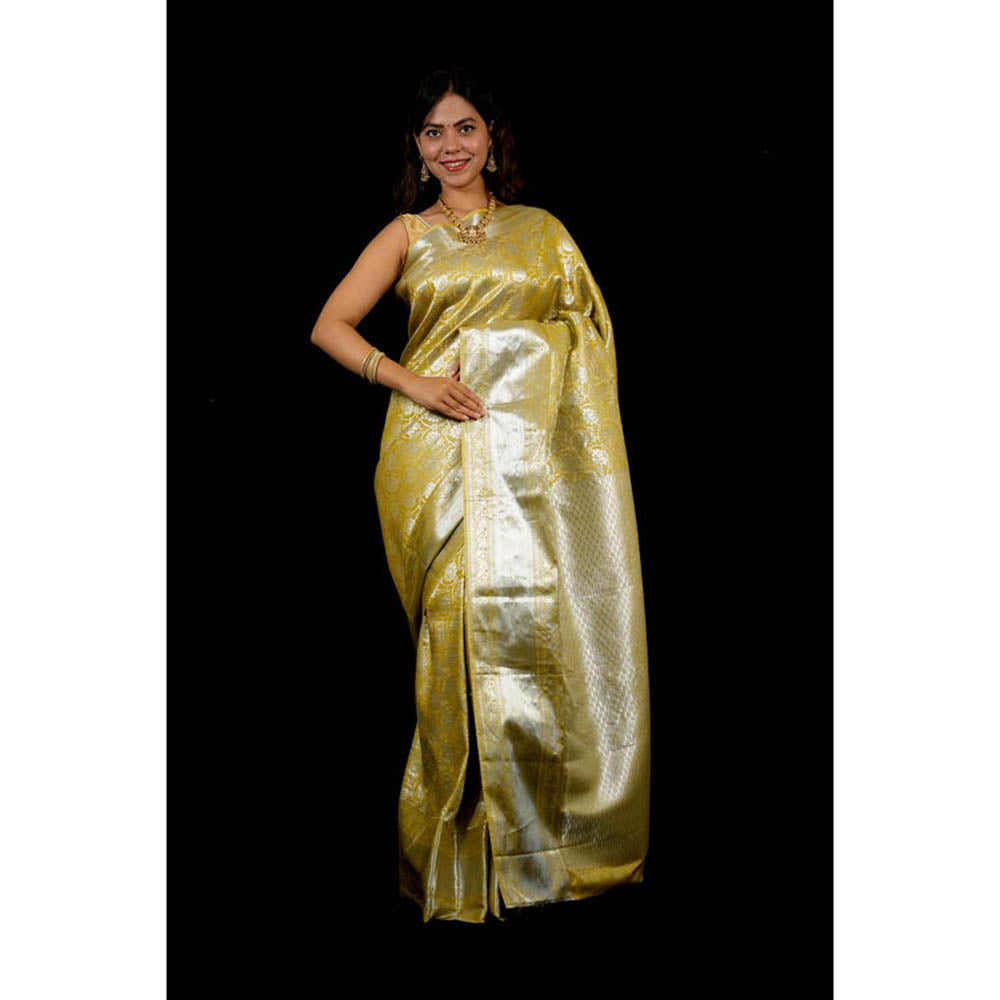 Womens Woven Zari Yellow Pre-Draped Saree With Unstitched Blouse