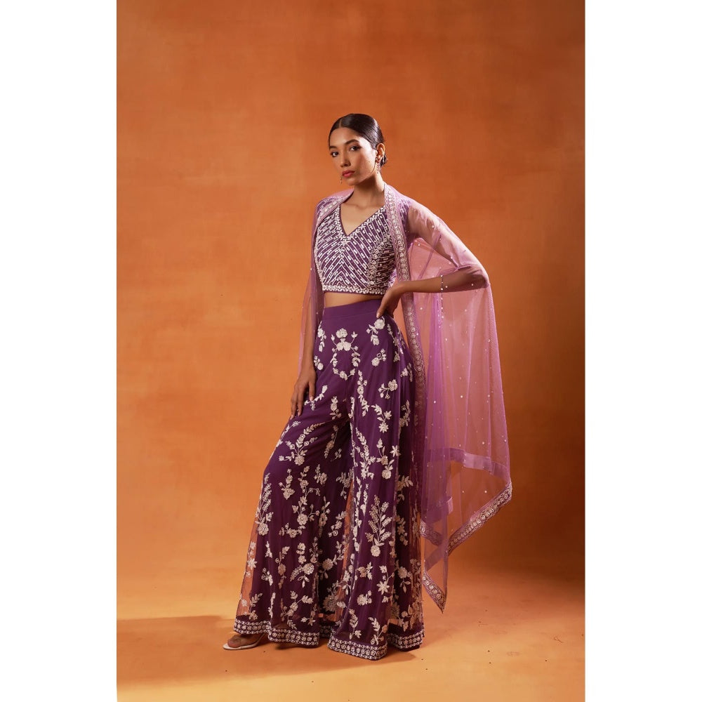 Purple Embellished Floral Indo-Western Crop Top with Palazzo and Cape (Set of 3)