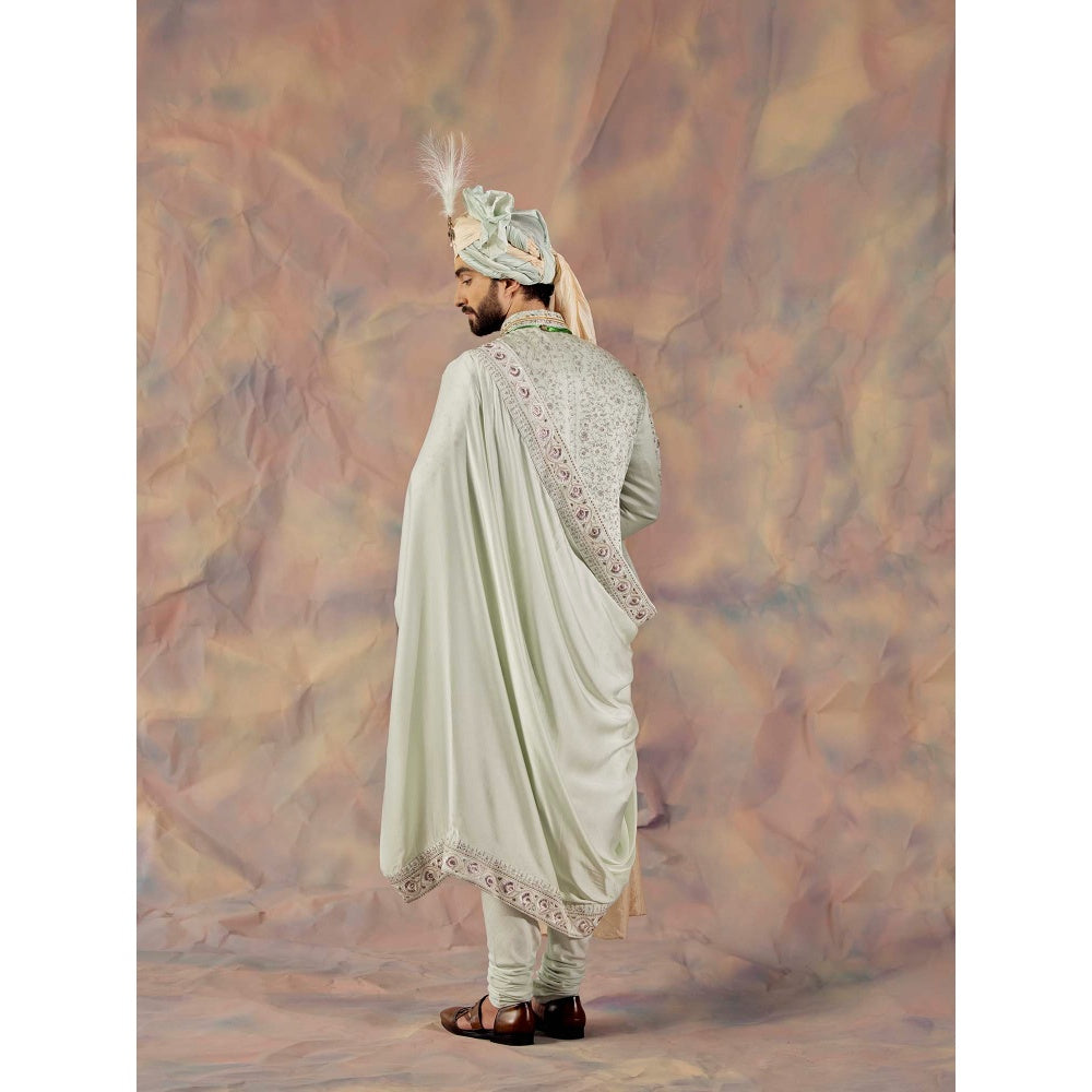 Description : Featuring hazy blue jamawar sherwani with multicored flower details and dabka highlighting. paired with tone on tone embroidered stole, matching safa, pintuck detailed kurta and churidar.