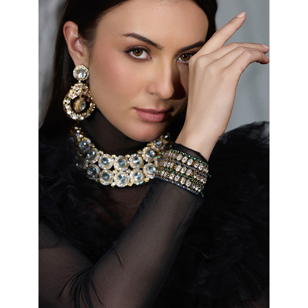 Description : A stunning layered bracelet with signning crystal-like stones, with deep green and navy beads. This piece adds a bold and modern touch; it goes with every outfit for any kind of festival.