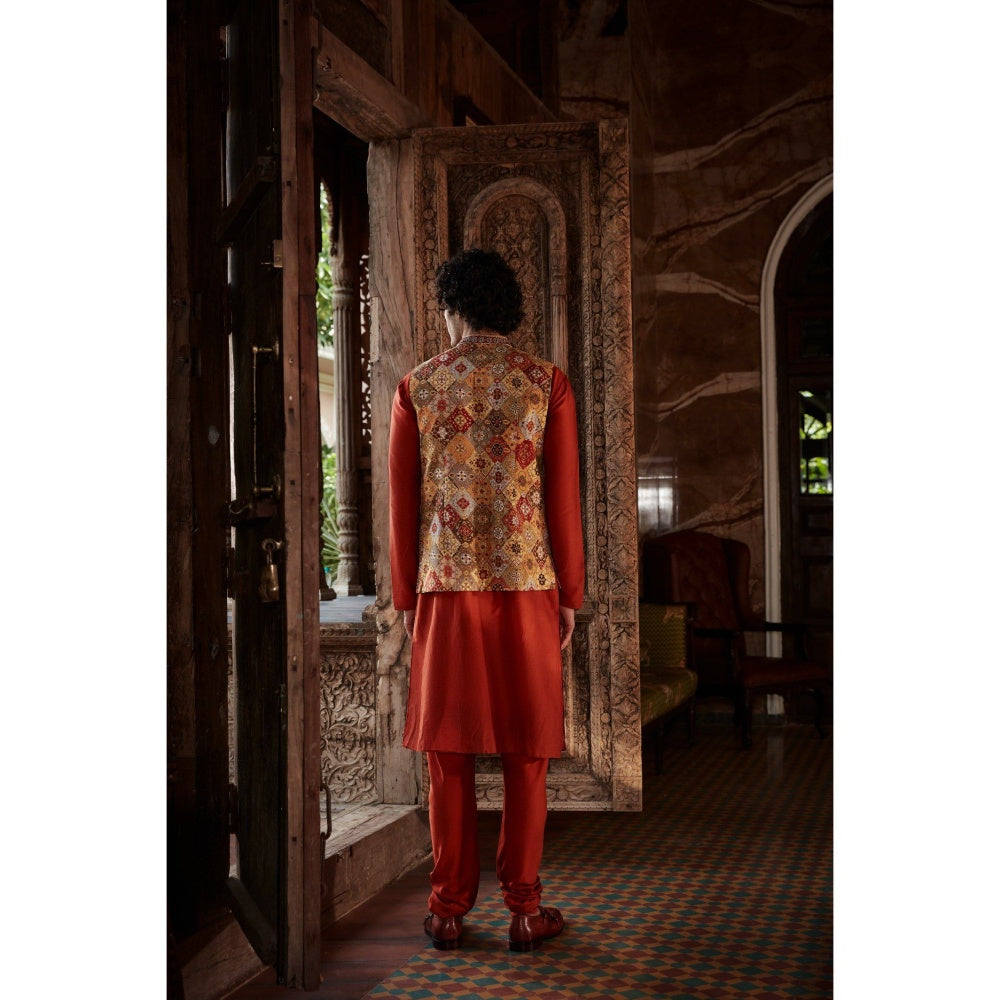 KALISTA Red Mihir Kurta with Churidar and Nehru Jacket (Set of 3)