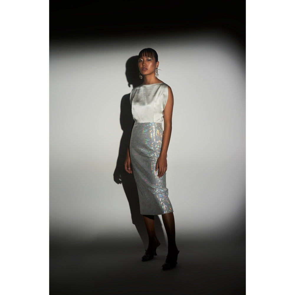 Description : Embrace everyday style by stepping out in this captivating sheen with sand wash satin & metallic jersey rainbow dress from Kangana Trehan. Made from high-quality satin, this piece features a sleeveless design and a boat neck. Style it with minimal jewellery and sandals to complete the ensemble.