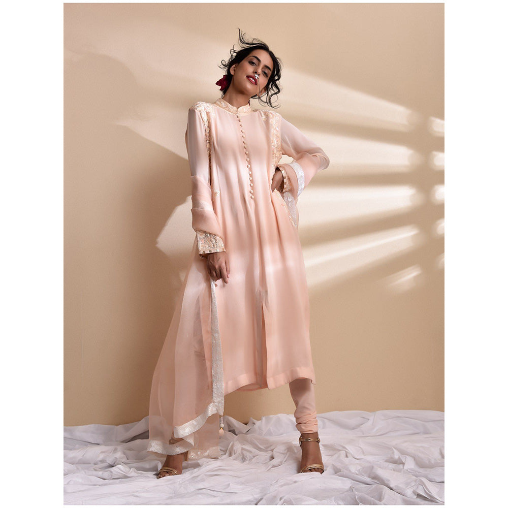 Description : Get in the ethnic vibes with this peach Anarkali Set by Kanika Sharma. Made from high quality georgette, it features button fly closure and embroidered pattern along with full sleeves & mandarin neck. Pair it with earrings and bangles to complete your ensemble.