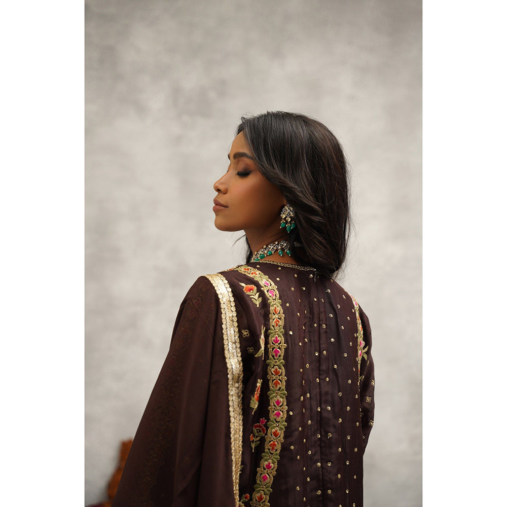 Kapda Dori Brown Embroidered Kurta with Churidar and Dupatta (Set of 3)