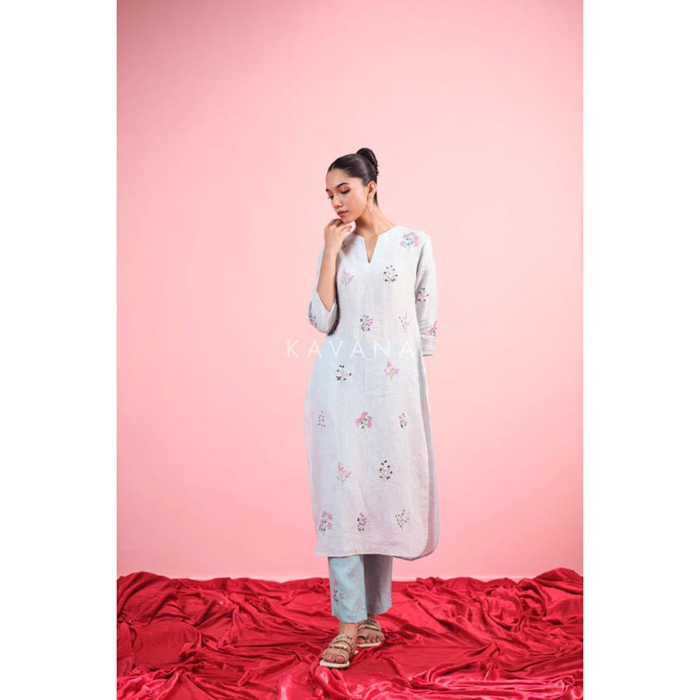 Step into elegance with the Aabhira kurta set, crafted from pure linen in a serene powder blue. This long kurta features a closed neck with a middle slit. The kurta is adorned with spread-out signature embroidery, adding a touch of sophistication. The Aabhira set offers a refined yet comfortable look, making it an ideal choice for both casual events and special occasions.