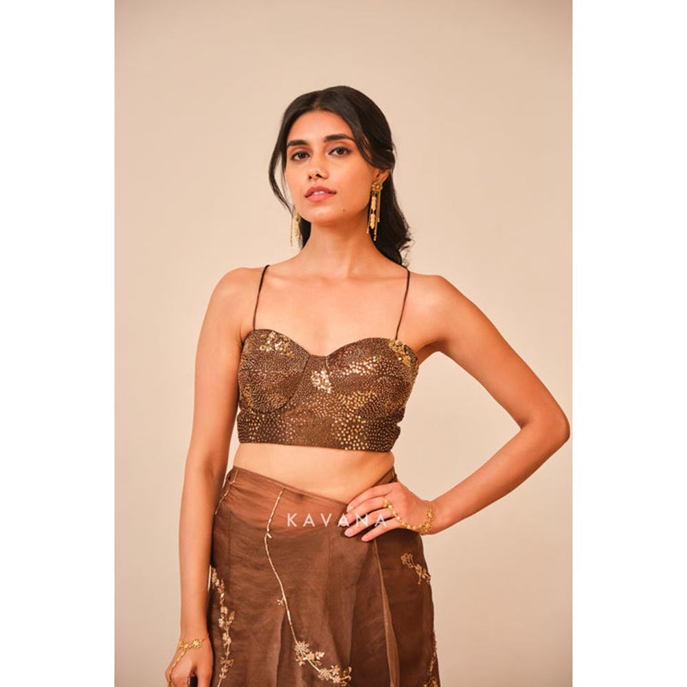 This Strappy Blouse in brown silk tissue fabric features a sweetheart neckline and intricate zardozi embroidery crafted with golden sequins, katdana, and beads on both the front and back. The tie-up closure at the back adds a graceful touch, while the golden bead tassels enhance its elegance. The blouse comes with bust pads for a structured fit.