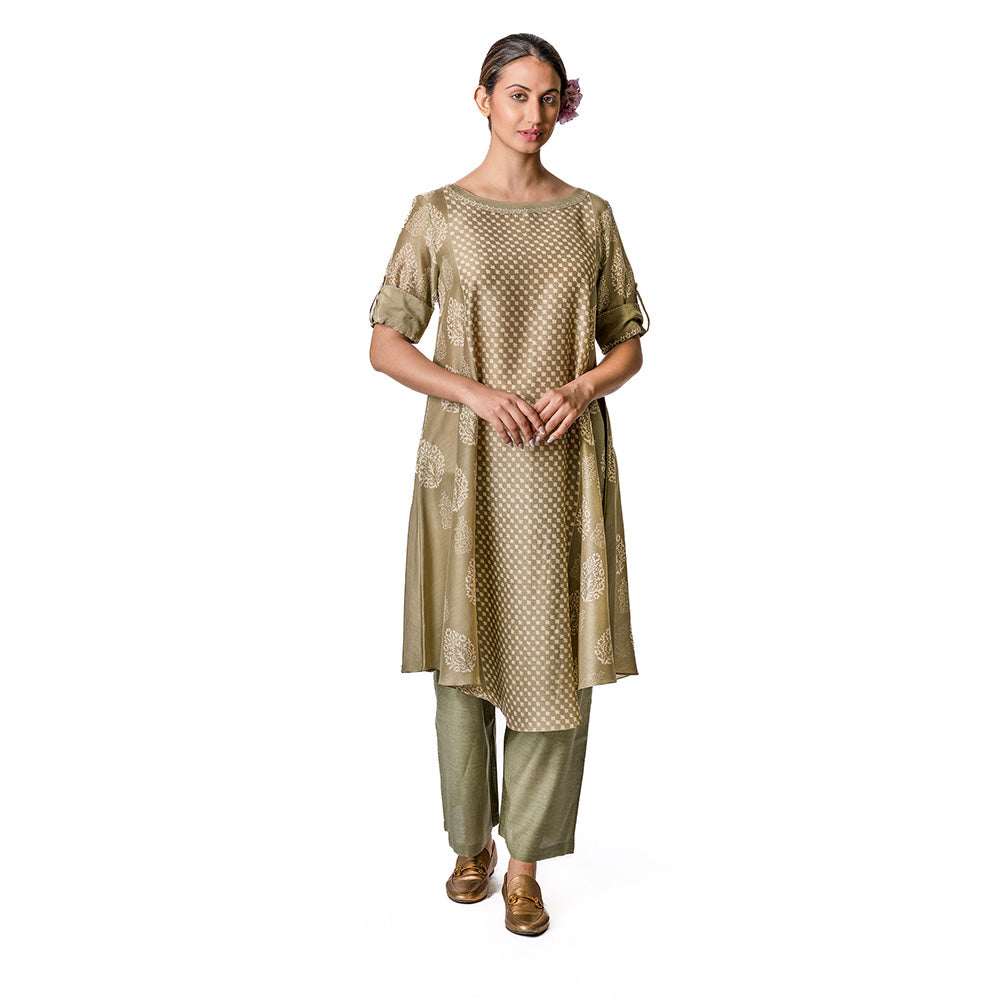 Krishna Mehta Olive Chanderi Tunic With Floral Block Printed Motifs