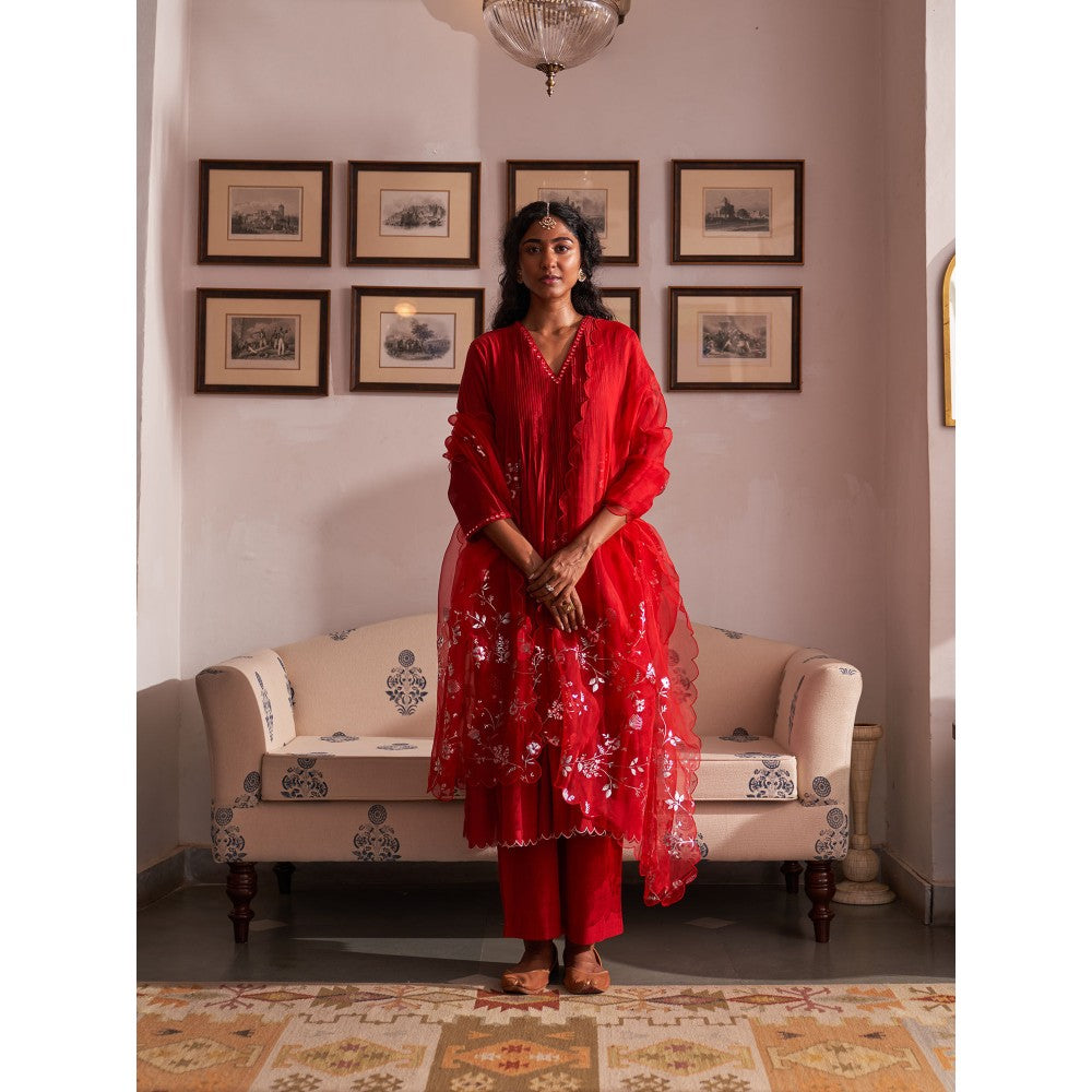 Red Anarkali & Pant with Dupatta (Set of 3)