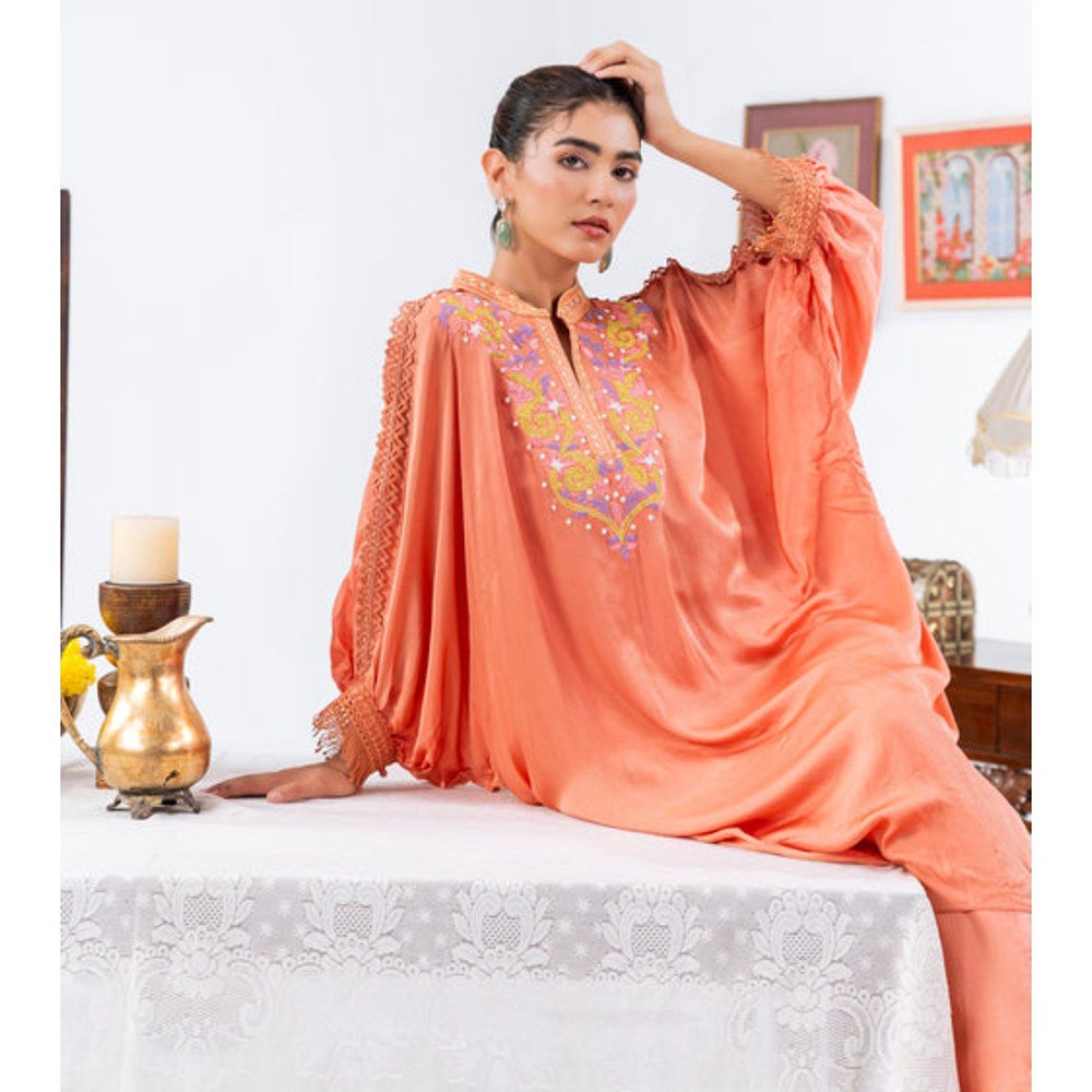 Description : Peach Chiffon Kaftan Kurta With Pant And Inner