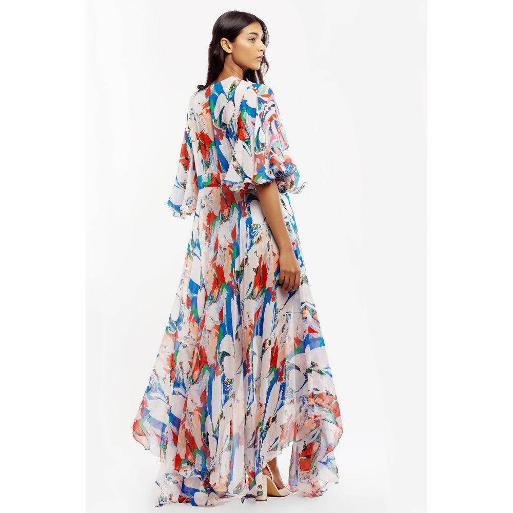 MANDIRA WIRK Lycra Printed Two Piece Bikini with Chiffon Cape Ivory & Blue (Set of 3)
