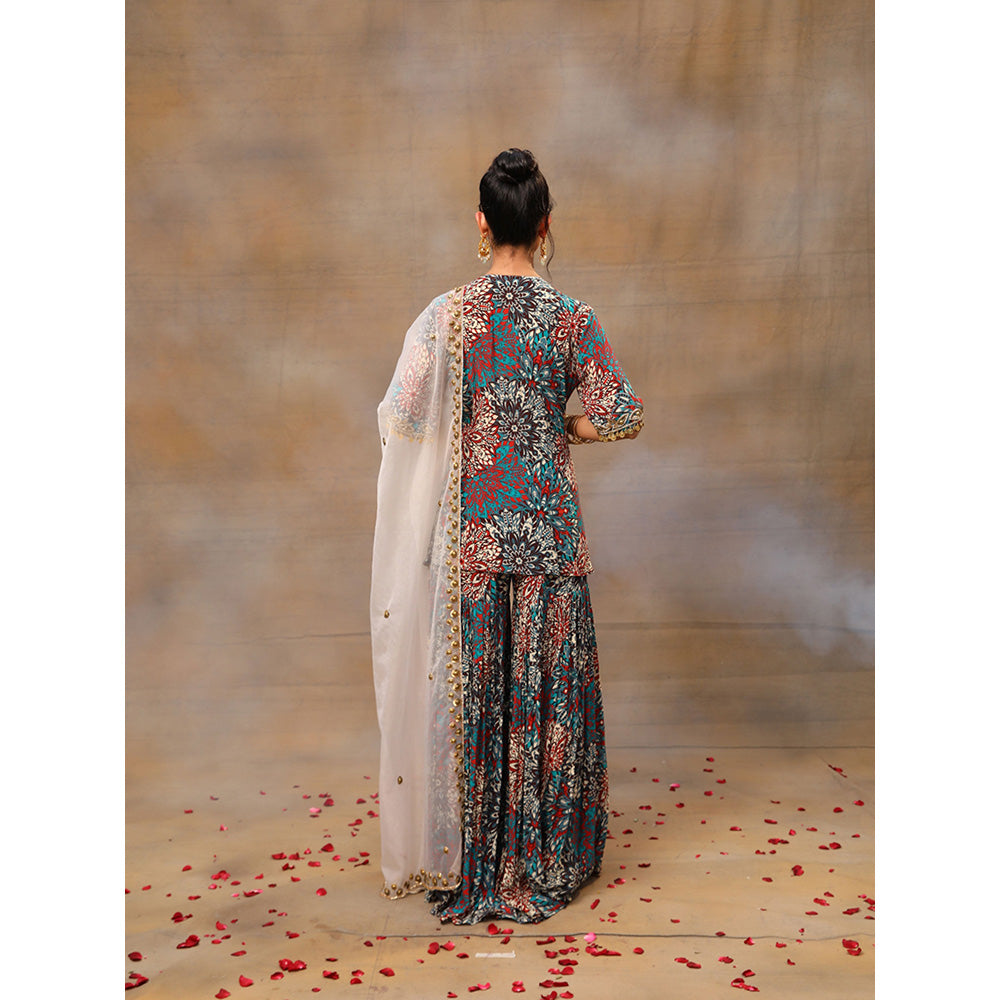 MEHAK MURPANA Green Printed Embroidered Short Kurta Sharara and Dupatta (Set of 3)
