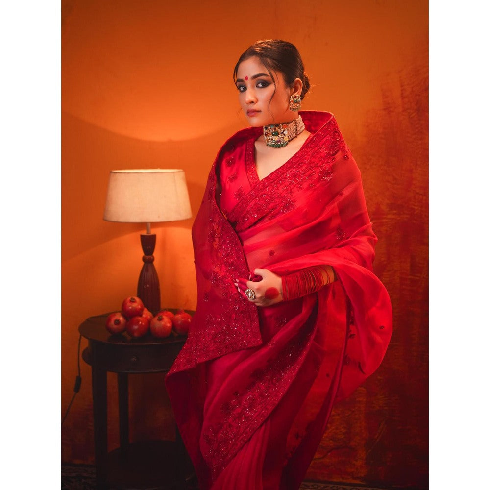 Midushi Bajoria Red Surkh Saree with Stitched Blouse